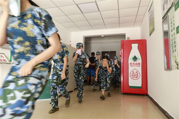 ? ? 當(dāng)消防警報聲響起時,新生們在教官的指揮下緊張又有序的從公寓樓內(nèi)向外疏散。學(xué)生們左手用毛巾等捂住口鼻,右手抱著后頸,防止?jié)鉄熯M(jìn)入口鼻對身體造成傷害。整個演練過程按照預(yù)定方案有序進(jìn)行,學(xué)生們認(rèn)真對待此次消防演練,井然有序的撤退。