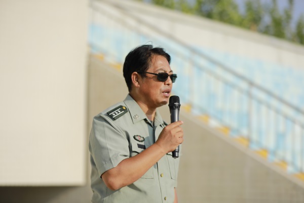 ? ? 上午8時30分,2018級新生在操場集合,軍訓團團長劉玉峰講話,鼓舞參與拉練活動的師生們。