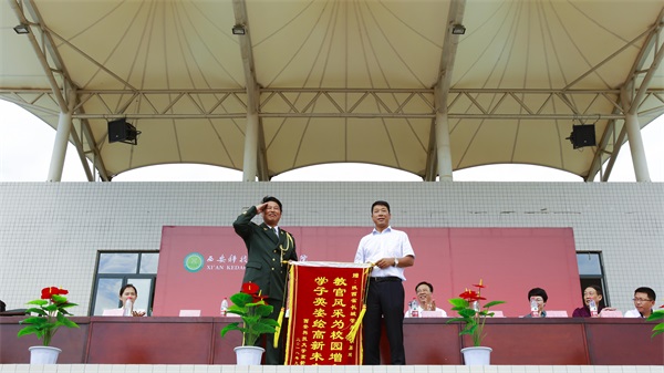 ? ? 黨委書記汪仁向承訓(xùn)部隊(duì)贈(zèng)送錦旗,對軍訓(xùn)團(tuán)的認(rèn)真負(fù)責(zé)表示認(rèn)可與感謝。