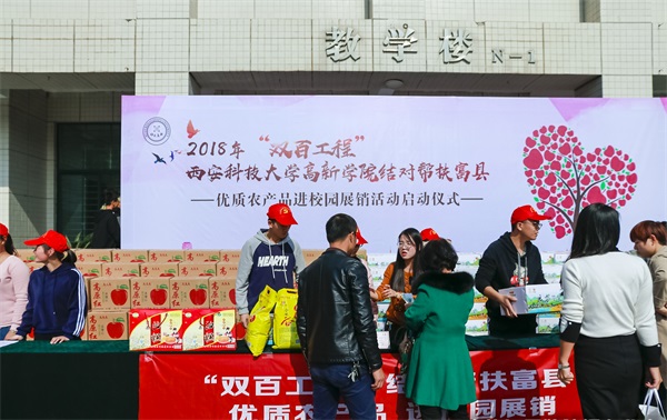 ? ? 為了貫徹落實關(guān)于“雙百工程”優(yōu)質(zhì)農(nóng)產(chǎn)品進校園活動工作要求,充分發(fā)揮高校助力脫貧攻堅的作用,更好地與結(jié)對幫扶縣區(qū)形成攻堅合力。11月1日,2018“雙百工程”西安科技大學高新學院結(jié)對幫扶富縣優(yōu)質(zhì)農(nóng)產(chǎn)品進校園展銷活動在我院北區(qū)創(chuàng)業(yè)廣場火熱啟動。學院黨委書記汪仁、副院長汪陽、副院長石峰、副院長董世平、富縣職業(yè)技術(shù)培訓中心主任高云以及各二級學院、相關(guān)職能部門負責人參加了啟動儀式。