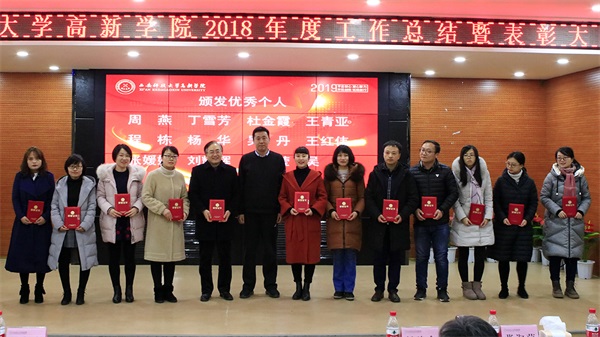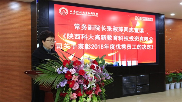 ? ? ? ? ? ? ? ? ? ? ? ? 常務(wù)副院長張淑萍宣讀《陜西科大高新教育科技投資有限公司關(guān)于表彰2018年度優(yōu)秀員工的決定》
