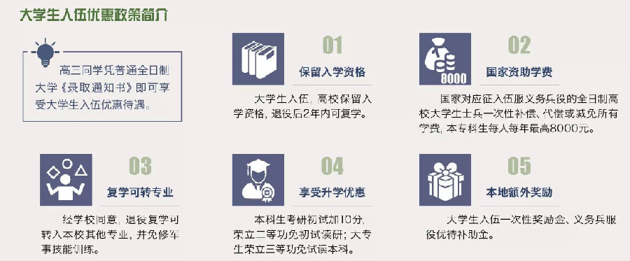 2.期間按國家有關規(guī)定保留學籍或入學資格,退役后2年內(nèi)允許復學或入學。相關手續(xù)由應征地縣級征兵辦公室和就讀高校負責辦理。