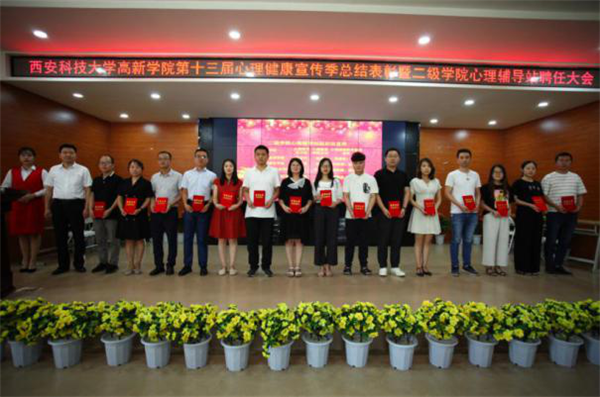 結(jié)合各院系組織、參與活動情況以及申報材料,經(jīng)綜合考核、評審,評選出了“心理健康宣傳季先進組織”、“心理健康宣傳季先進個人”、“心理情景劇優(yōu)秀作品”、“心理知識競賽獲獎團隊”、“陽光寢室”、“心理攝影、繪畫類獲獎作品”、“團體心理輔導獲獎團隊”和“優(yōu)秀咨詢案例”八大獎項。由陳雪梅處長宣讀了《關(guān)于表彰第十三屆“5.25”心理健康宣傳季先進集體和先進個人的決定》,參會領(lǐng)導為獲獎單位和個人頒獎。 大會第二部分是為我院首屆朋輩心理輔導咨詢員和二級學院心理輔導站人員進行聘任。首先由戴軍主任宣讀《關(guān)于聘任唐靜等10名同學為思政部心理教育與咨詢中心朋輩心理輔導咨詢員的通知》,并為同學頒發(fā)聘書。接著由孫龍運主席宣讀《關(guān)于西安科技大學高新學院二級學院心理輔導站人員聘任的通知》,潘昊副院長為各二級學院心理輔導站主任、副主任和指導老師頒發(fā)了聘書。