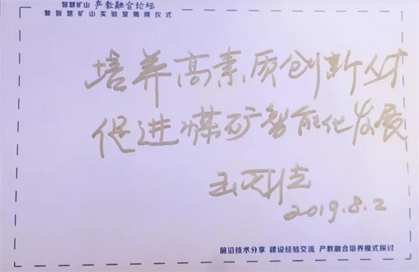 ? ? ? ?論壇結(jié)束后,王國(guó)法院士與參加論壇的有關(guān)單位領(lǐng)導(dǎo)、專(zhuān)家一起到智慧礦山實(shí)驗(yàn)室參觀指導(dǎo),并對(duì)實(shí)驗(yàn)室的建設(shè)程度給予充分的肯定。院士表示,西安科技大學(xué)高新學(xué)院作為獨(dú)立學(xué)院,充分發(fā)揮了自身年輕靈活的優(yōu)勢(shì),與華夏天信共建的實(shí)驗(yàn)室可以作為煤炭行業(yè)高素質(zhì)創(chuàng)新人才的培養(yǎng)基地,必將為煤炭行業(yè)高質(zhì)量發(fā)展提供更多的生力軍。王國(guó)法院士對(duì)學(xué)院寄予厚望,并題詞鼓勵(lì)師生。