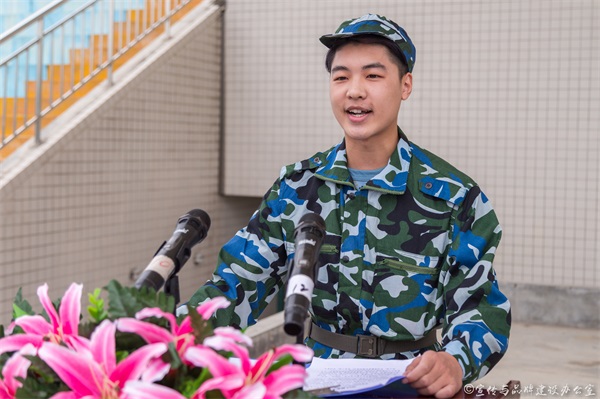 緊接著,新生代表王千玉同學(xué)代表全體學(xué)員發(fā)言,他承諾:軍訓(xùn)期間將按照教官要求刻苦訓(xùn)練,思想上、行動(dòng)上都以軍人的標(biāo)準(zhǔn)嚴(yán)格要求自己,以服務(wù)國(guó)防,保家衛(wèi)國(guó)的信念武裝自己,嚴(yán)格遵守紀(jì)律,一切聽從指揮;希望同學(xué)們?cè)鲩L(zhǎng)才干,爭(zhēng)當(dāng)模范,增強(qiáng)文明修養(yǎng)的自覺性。積極配合教官完成訓(xùn)練,發(fā)揮自身才干,發(fā)掘自身才能,爭(zhēng)當(dāng)軍訓(xùn)標(biāo)兵。尊重教官,友愛同學(xué),堅(jiān)決杜絕拖拉松垮的散漫作風(fēng)。
