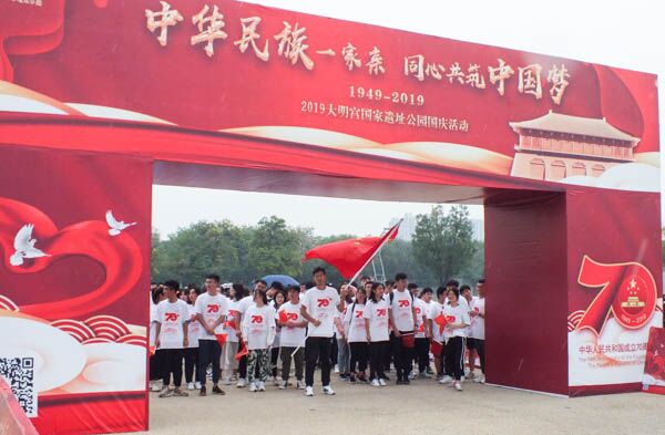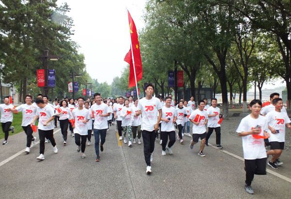 早上九時,現場下起了蒙蒙細雨。西安十所高校的近500名學子到達指定地點陸續(xù)簽到,他們手持小國旗穿著統(tǒng)一的參賽服裝,在工作人員的帶領下伸展身體,拉伸筋骨,一張張青春的臉龐散發(fā)著無限的朝氣與活力,興奮的站在起跑線前,等待著那一聲哨響。隨著“比賽開始”一聲令下,各個隊伍一起開跑,現場加油助陣的聲音讓氣氛炒到最熱。賽場上, 大家精神抖擻,斗志昂揚,有不乏追求速度的勇士,但更多的是尋找快樂和自我突破的跑者,他們齊心協(xié)力、奮勇爭先喜迎國慶,他們用無限的熱情與激情表達對祖國最真摯的祝福。希望和祝福在奔跑中不斷傳遞,大家跑出了健康和諧、跑出了團結互助、跑出了快樂自信、跑出了大學生昂揚向上的精神、跑出了一道靚麗的風景!在歡樂的接力跑結束后,緊接著就是指壓板單腿跳、轉布條、一箭穿心等一系列趣味障礙接力賽,這次比賽是一次放松身心、消除疲勞、調節(jié)情緒、緩解壓力的機會,通過默契的配合增進了同學們之間的相互交流,豐富了課余生活。