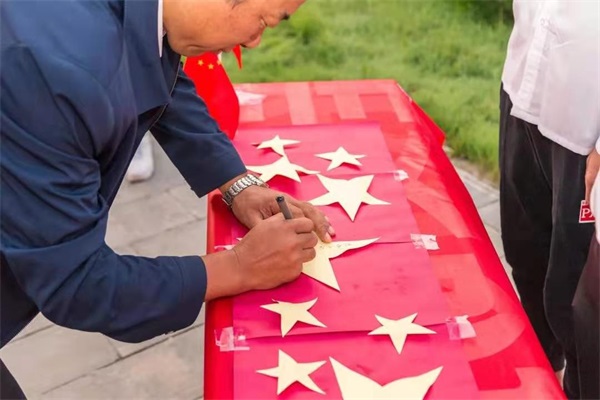 活動(dòng)第五項(xiàng),我校各領(lǐng)導(dǎo)師生移步至圖書館側(cè)參加“我為祖國獻(xiàn)祝?!被顒?dòng),將自己的祝福寫在金黃的五角星上,獻(xiàn)給我們偉大的祖國。