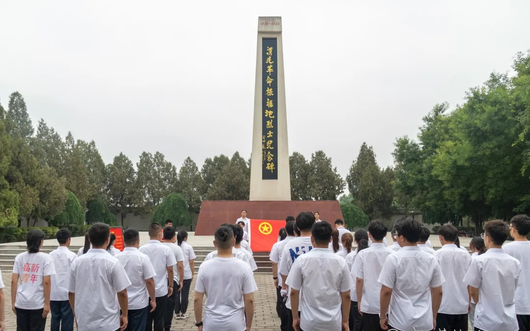 ? ? ? ? ——追憶先烈:講黨史故事,憶革命事跡。在陵前鎮(zhèn)中學(xué)教學(xué)樓前,來自該院的實(shí)踐團(tuán)隊(duì)隆重舉行升旗儀式,隨后前往渭北革命根據(jù)地烈士紀(jì)念碑,在紀(jì)念碑前志愿者們?yōu)榱沂砍镣茨?,并莊嚴(yán)宣讀入團(tuán)誓詞。當(dāng)天下午,志愿者們集體來到三原縣黨史學(xué)習(xí)教育基地進(jìn)行參觀,并邀請到兩位擁有數(shù)十年黨齡的老人,圍繞渭北革命根據(jù)地為志愿者們講述黨的故事,講述那些為黨奉獻(xiàn)犧牲的老革命前輩們,撐起陜西革命事業(yè)發(fā)展的精彩故事。革命先輩“百折不撓、無私奉獻(xiàn),敢闖新路,團(tuán)結(jié)奮斗”的渭北革命精神,感染了在場的同學(xué)們,備受鼓舞的青年一代,將汲取和弘揚(yáng)革命一代艱苦奮斗的渭北精神,成為前行的智慧和力量。