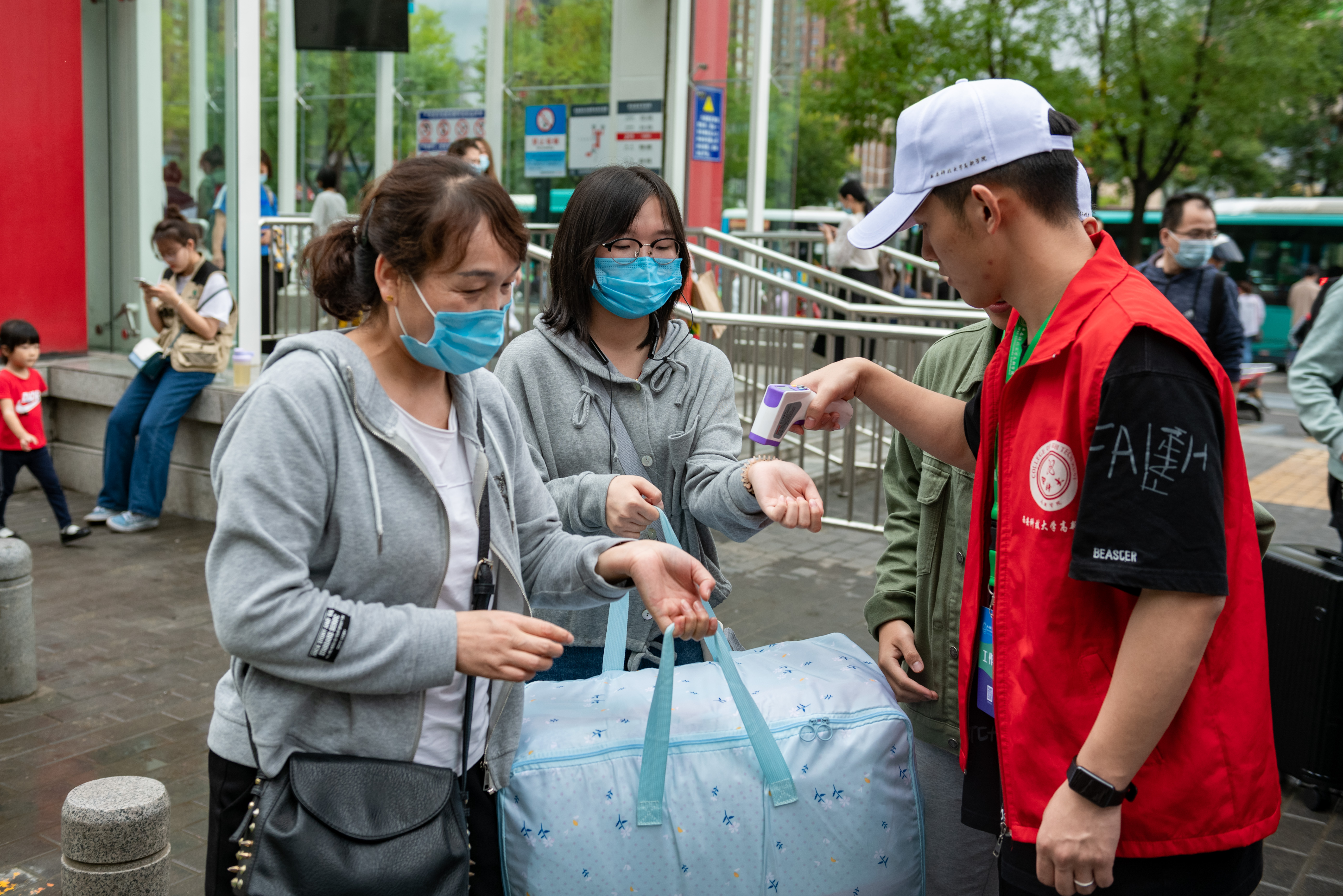 該院配備校車在最近的地鐵口接送新生家長,現(xiàn)場測量體溫,對行李進行消毒