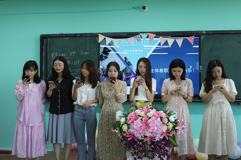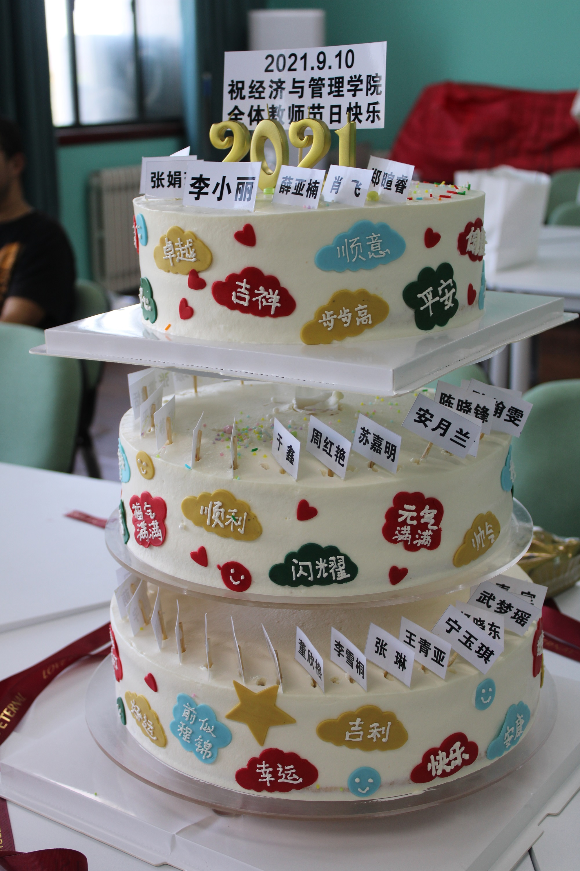 ? ? ? ?為了讓老師們度過一個(gè)難忘而有意義的節(jié)日,經(jīng)濟(jì)與管理學(xué)院領(lǐng)導(dǎo)班子特意為全體教師定制了節(jié)日祝福蛋糕,上面寫著每一位教職工的姓名,傳遞著濃濃暖意。老師們分享著蛋糕,整個(gè)活動(dòng)室一派溫馨、溫暖,大家用心感受著這份意外驚喜。