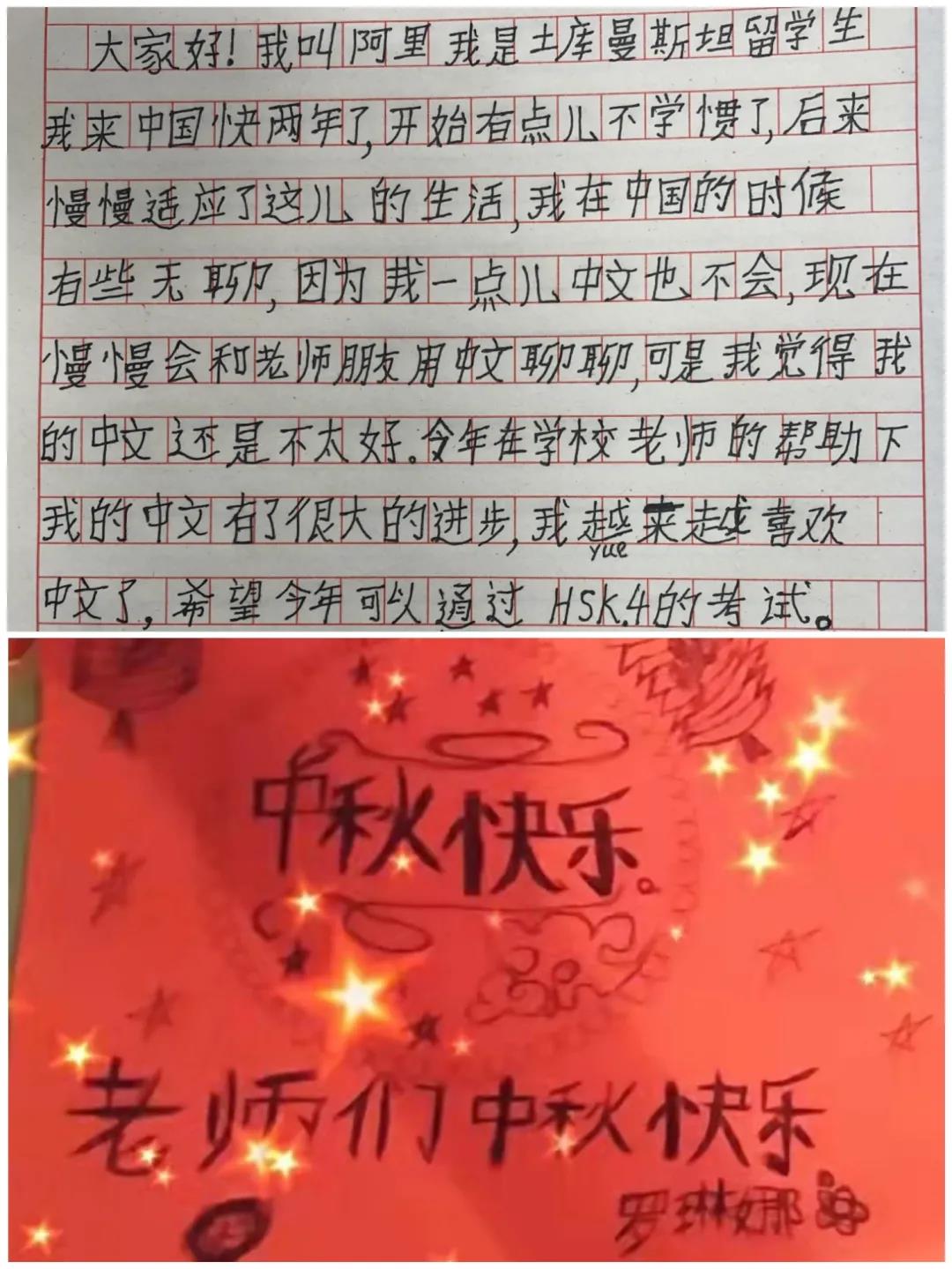 ? ? ? ?師生一起演唱曲調(diào)婉轉(zhuǎn)柔美的中文歌曲《月亮代表我的心》,教室中洋溢著歡聲笑語(yǔ),師生共載歌舞,共度中秋。