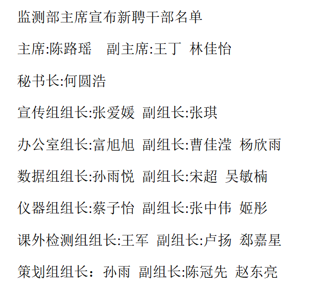 ? ? ? ?會(huì)上宣讀了新聘干部名單。體質(zhì)監(jiān)測(cè)部負(fù)責(zé)人劉先鋒總結(jié)發(fā)言,并對(duì)新任干部及干事提出了期望和要求:“希望在這個(gè)大家庭中,同學(xué)們可以互敬互愛(ài),積極主動(dòng),期待大家共同進(jìn)步、共同成長(zhǎng)”。
