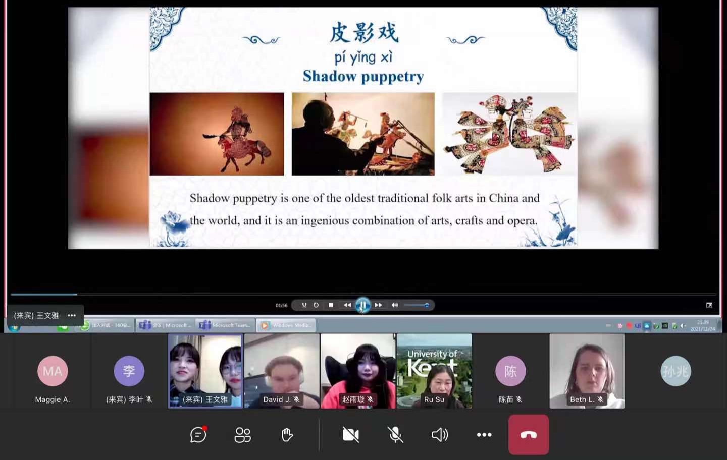 ? ? ? ?北京時間2021年11月24日21:30至22:30,由教育部中外語言交流合作中心支持、西安科技大學高新學院與英國肯特大學合作舉辦的“漢語橋”線上團組交流項目“云游十三朝古都——西安”七大特色文化專題項目的第三站“舞動雙手制作皮影.創(chuàng)造戲劇人生——體驗關(guān)中民俗手工藝品 ”文化課程體驗之旅如期舉行,西安科技大學高新學院與英國肯特大學師生相聚云端,分享交流。