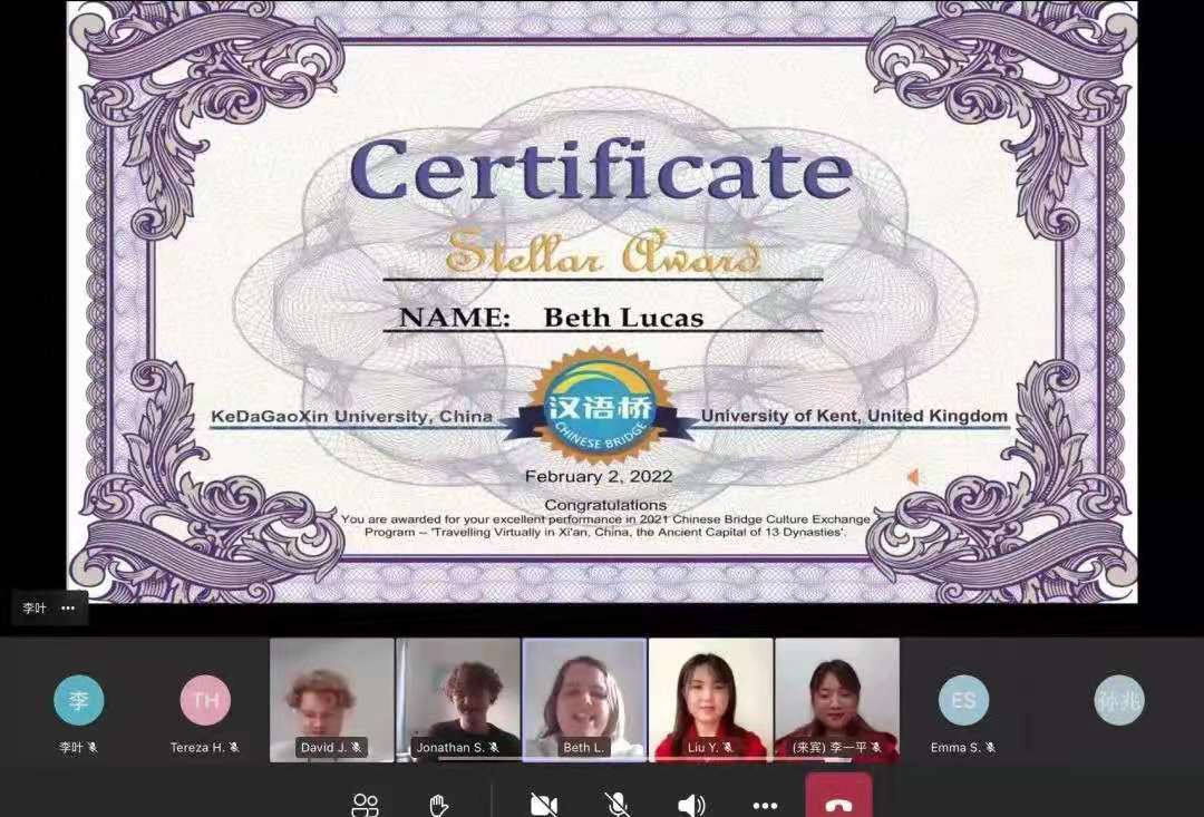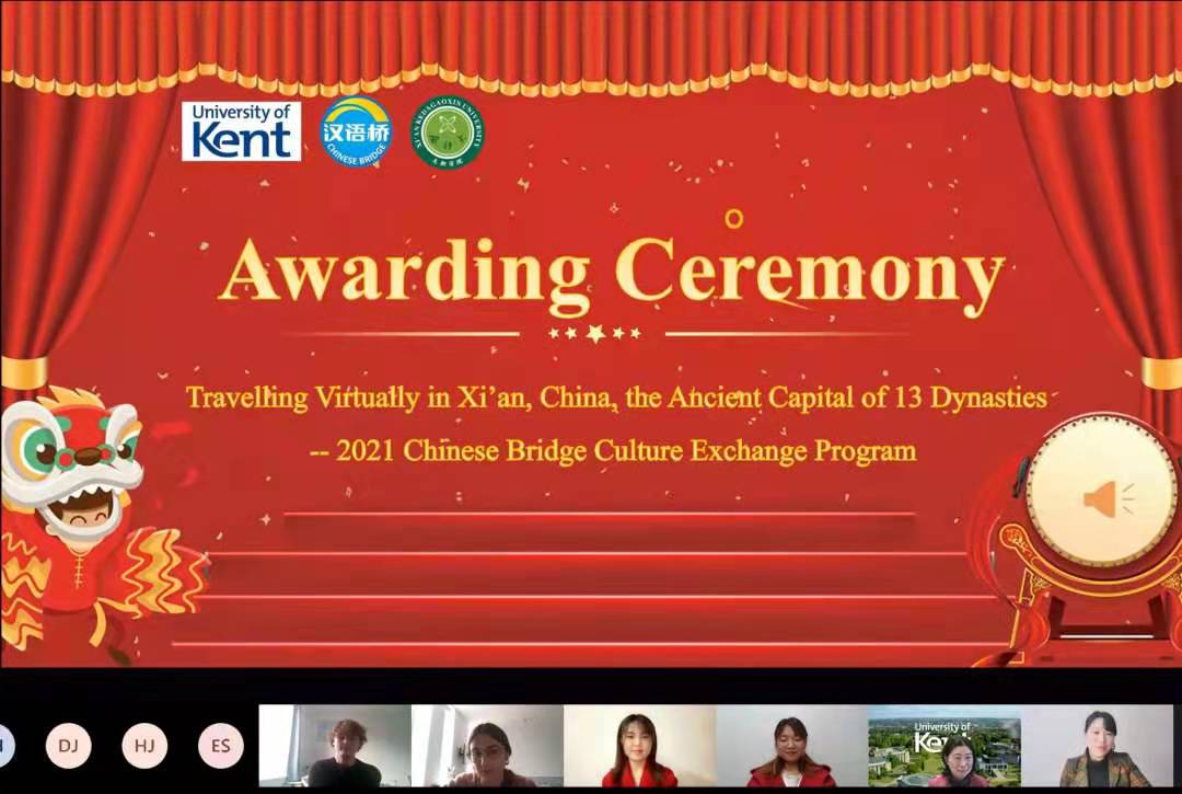 ? ? ? ? 北京時(shí)間2022年2月2日,由教育部中外語言交流合作中心支持,西安科技大學(xué)高新學(xué)院與英國(guó)肯特大學(xué)合作舉辦的“漢語橋”線上團(tuán)組交流項(xiàng)目“云游十三朝古都——西安”七大特色文化專題項(xiàng)目圓滿結(jié)束,結(jié)營(yíng)儀式在Teams線上平臺(tái)舉行。