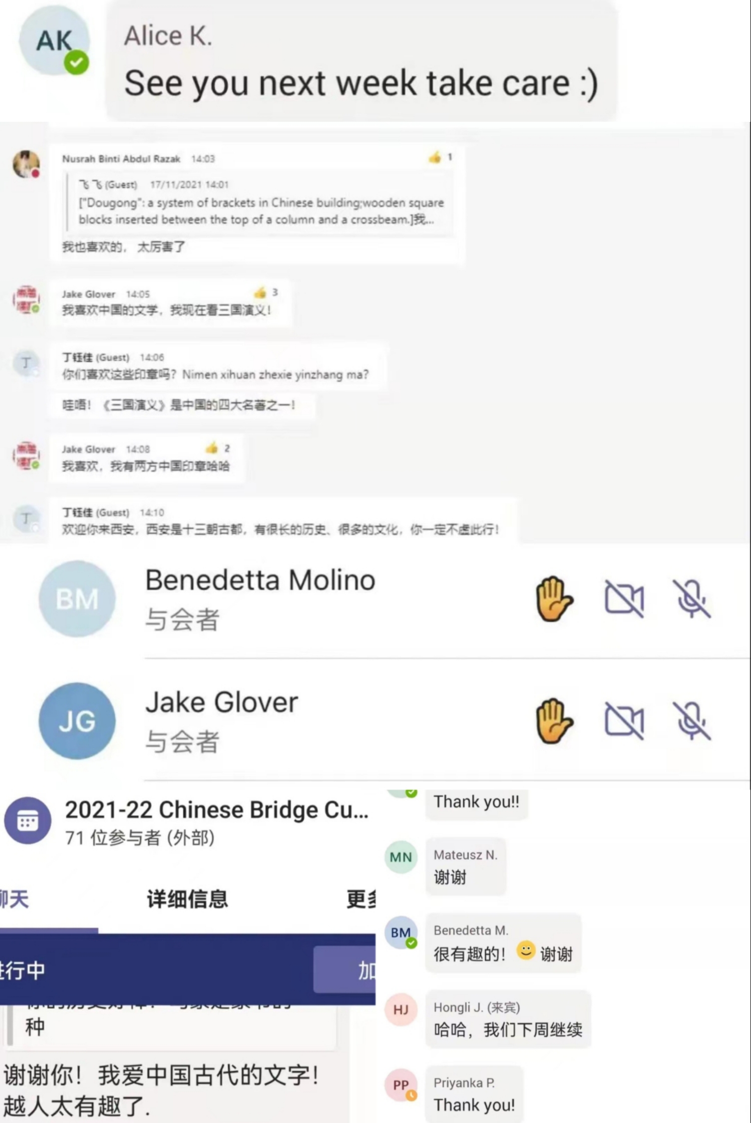 ? ? ? ?英國(guó)肯特大學(xué)藝術(shù)和人文科學(xué)部語言中心主任Wissia Fiorucci博士表示:“漢語橋線上團(tuán)組項(xiàng)目‘云游十三朝古都—西安’內(nèi)容非常精彩,本次項(xiàng)目也是我們兩校一次非常成功的合作嘗試。項(xiàng)目?jī)?nèi)容豐富了肯特大學(xué)的漢語教學(xué),項(xiàng)目從第一期開始就在學(xué)生中引起了很大反響,從選材制作到直播講解每個(gè)環(huán)節(jié)的質(zhì)量都帶給了我們很大震感。這個(gè)項(xiàng)目最近也被肯特Internationalization部門收入,列為一個(gè)線上交流活動(dòng)的實(shí)例之一。非常感謝西安科技大學(xué)高新學(xué)院漢語國(guó)際教育教師團(tuán)隊(duì),為我們帶來專業(yè)水平的視頻和講座,我們被你們的專業(yè)精神和創(chuàng)新精神所折服?!?/p>