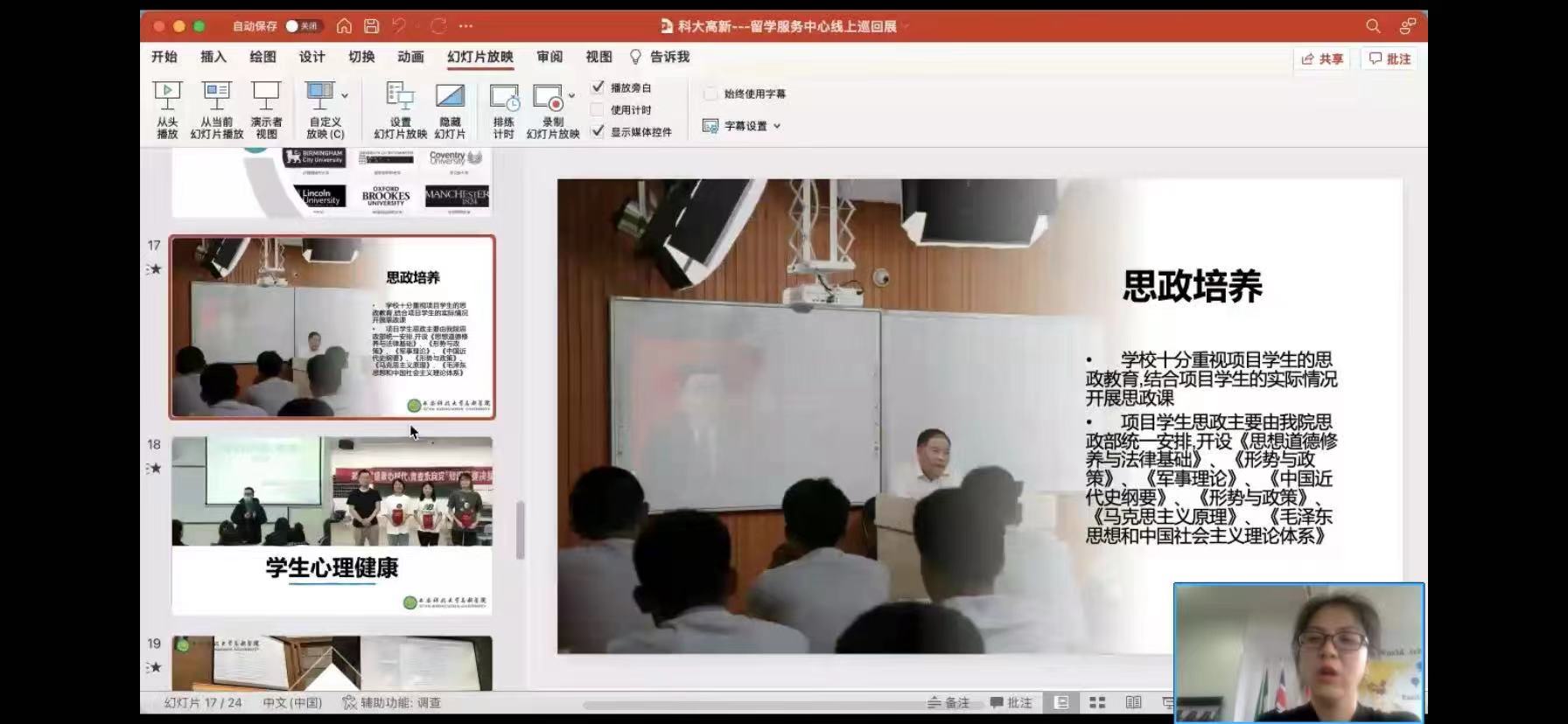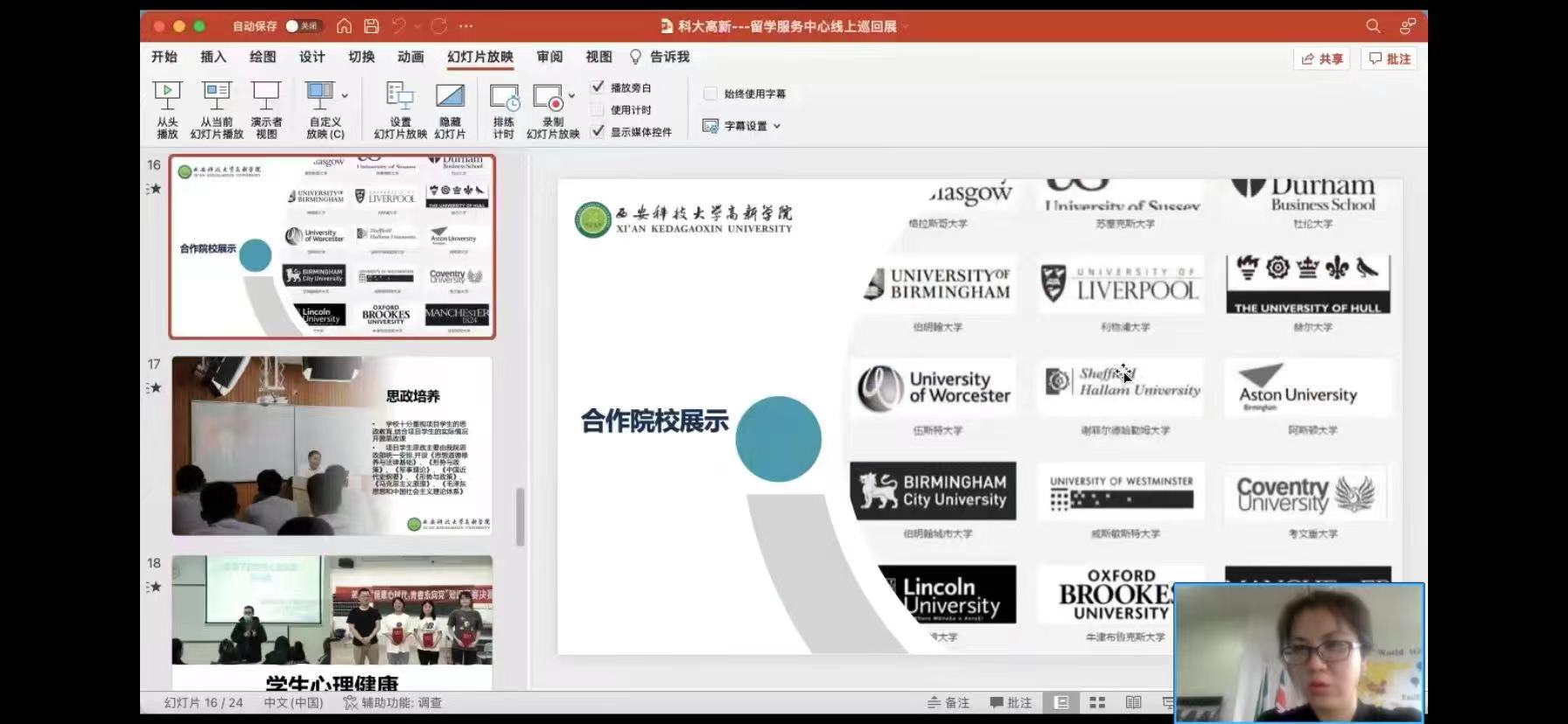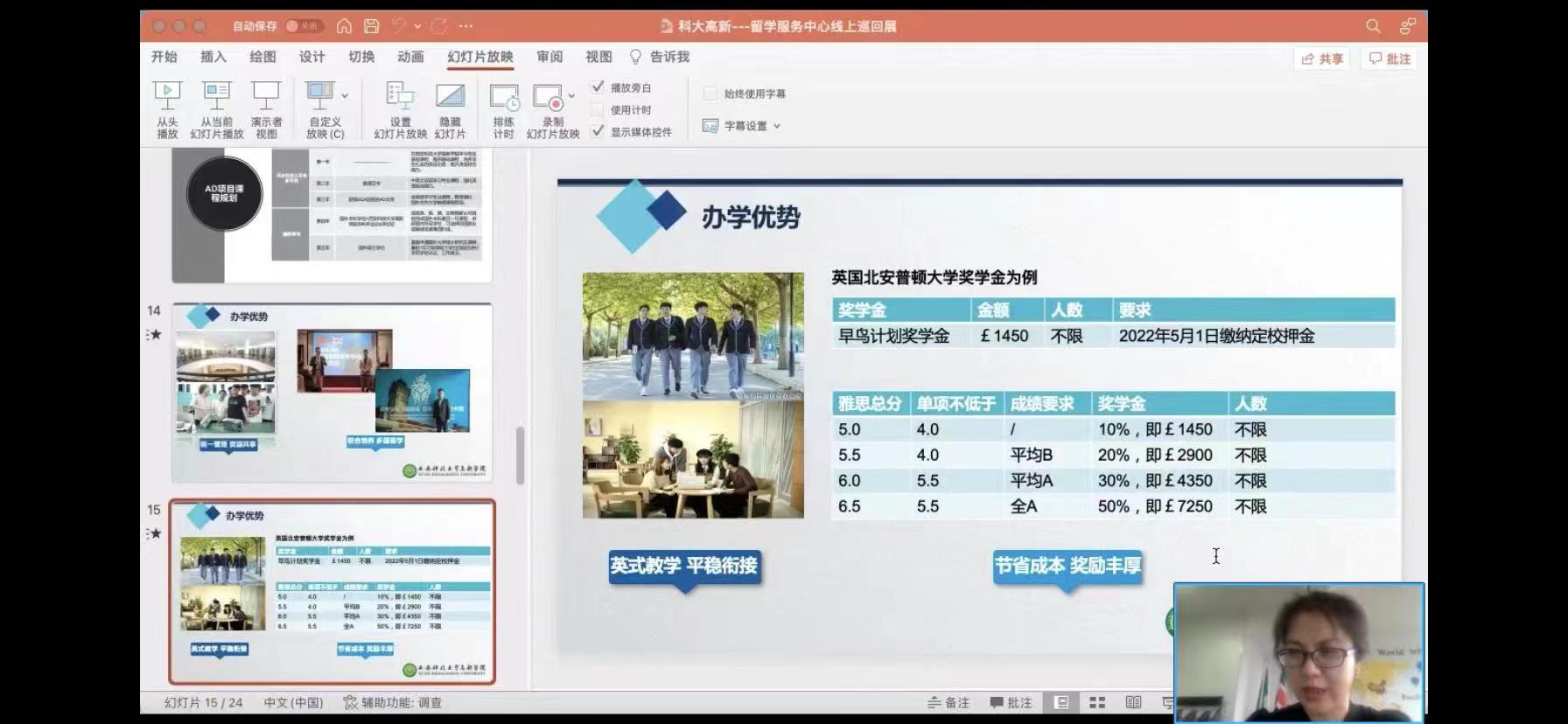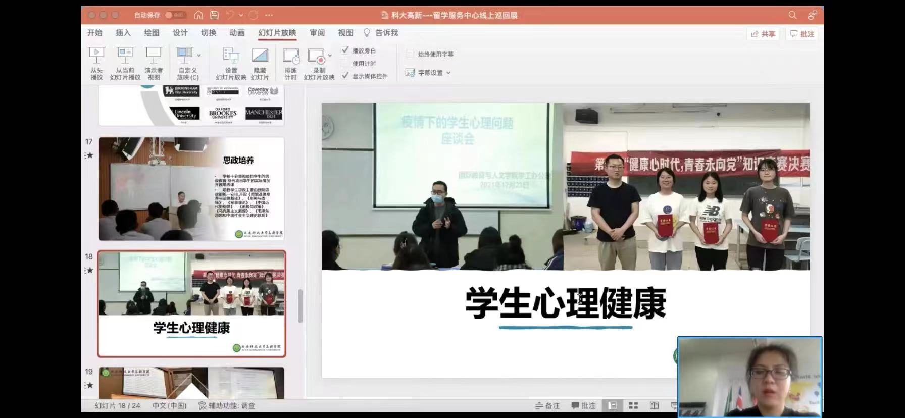 ? ? ? ? 西安科技大學(xué)高新學(xué)院作為中國(guó)(教育部)留學(xué)服務(wù)中心合作伙伴院校,受邀成為本次國(guó)際教育巡回展的參展院校之一,4月24日下午開啟主題為“來科大高新拿雙學(xué)位——讓世界名校體驗(yàn)觸手可及”的線上直播。此次直播由西安科技大學(xué)高新學(xué)院SQA AD項(xiàng)目主管周雨霏老師主講,主要從學(xué)校開設(shè)的國(guó)際項(xiàng)目、課程設(shè)置、辦學(xué)特色等諸多熱點(diǎn)話題與同學(xué)和家長(zhǎng)們進(jìn)行在線交流。直播開始后,周雨霏老師精心準(zhǔn)備了內(nèi)容豐富的展示視頻及內(nèi)容詳實(shí)的宣傳資料,重點(diǎn)展示出高新學(xué)院的獨(dú)特優(yōu)勢(shì)及辦學(xué)實(shí)力。