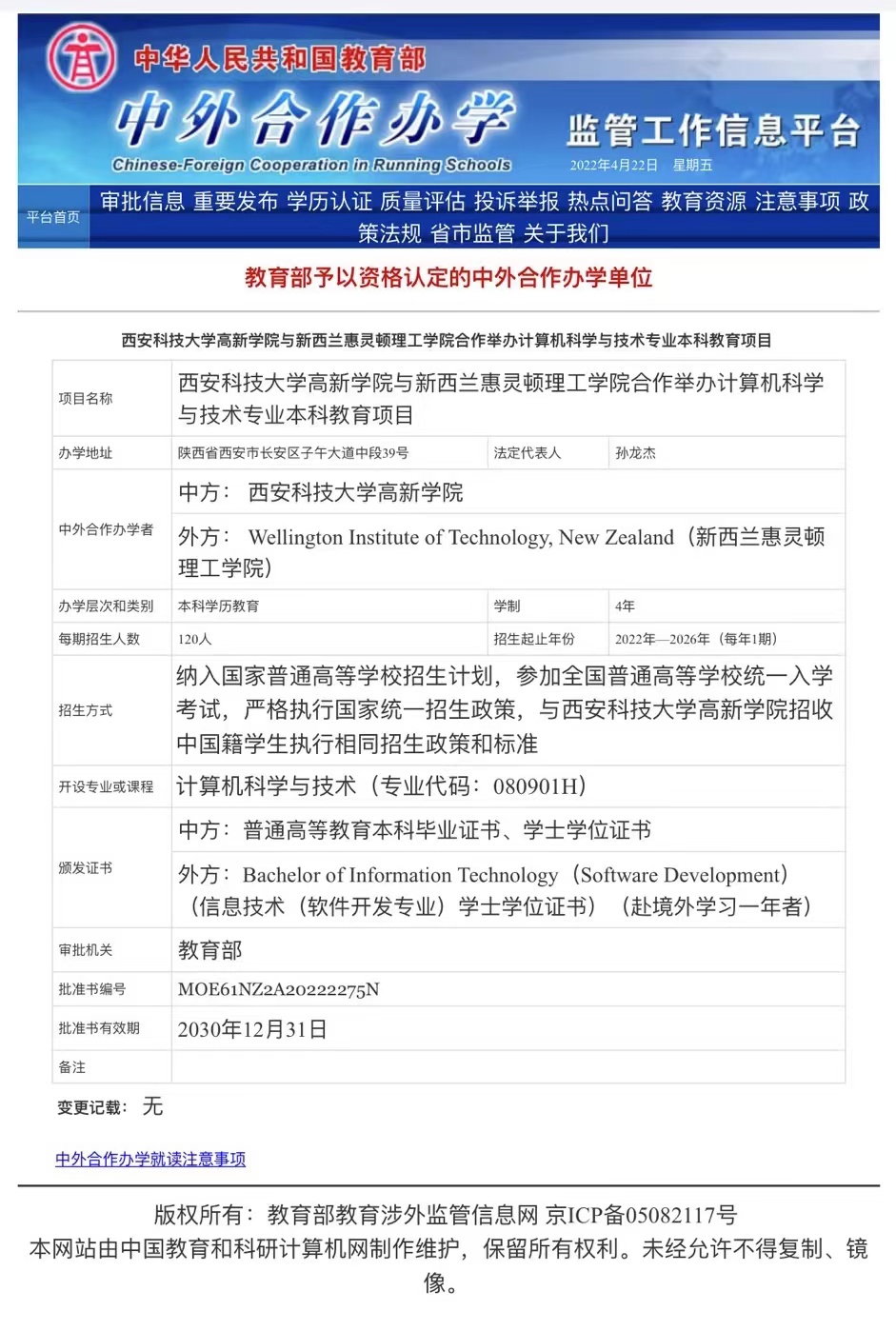 ?近日,西安科技大學高新學院與新西蘭惠靈頓理工學院(Wellington Institute of Technology)合作舉辦的計算機科學與技術(shù)專業(yè)本科層次中外合作辦學項目獲批。這是該院繼與英國卡迪夫城市大學合作舉辦的軟件技術(shù)專業(yè)高等??茖W歷教育項目后又一中外合作辦學項目,也是該院獲批的首例本科層次中外合作辦學項目,標志著該院國際化辦學實力獲得了教育部專家的認可,國際化辦學取得了重大進展,與國外高校的國際交流與合作進入了新的階段。