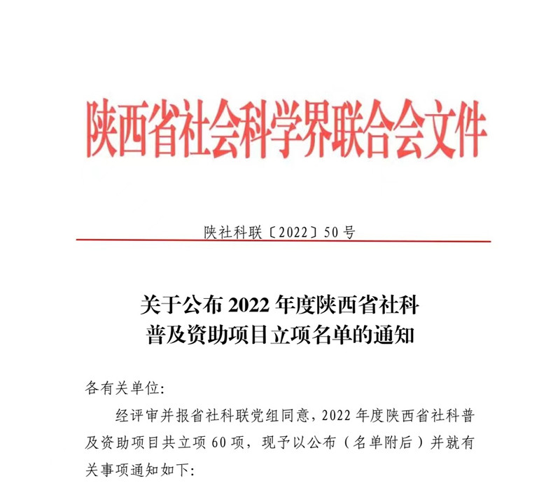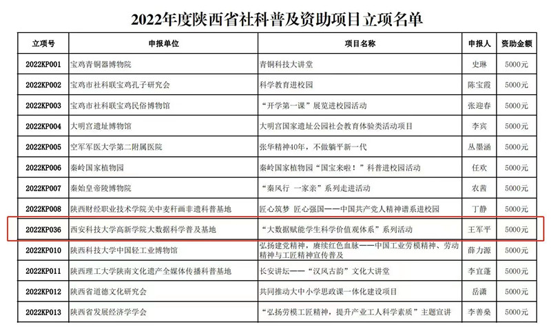 5月20日,經(jīng)過陜西省社會科學(xué)聯(lián)合會基金項目立項評審會議評審、陜西省社會科學(xué)聯(lián)合會領(lǐng)導(dǎo)小組研究同意,陜西省社會科學(xué)界聯(lián)合會近日發(fā)布了《關(guān)于公布2022年度陜西省社科普及資助項目立項名單的通知》,在經(jīng)濟與管理學(xué)院王軍平老師指導(dǎo)下,經(jīng)濟與管理學(xué)院大數(shù)據(jù)教研室申報的《“大數(shù)據(jù)賦能學(xué)生科學(xué)價值觀體系”系列活動》獲批立項。