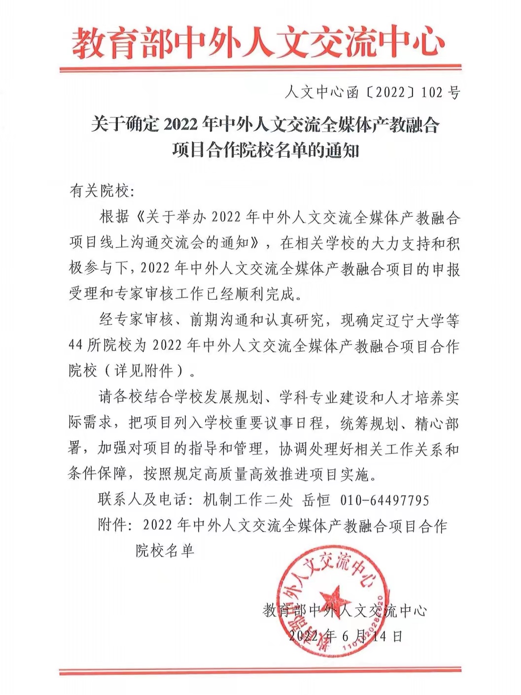 ? ? ? ?6月14日,教育部中外人文交流中心公布《關于確定2022年中外人文交流全媒體產教融合項目合作院校名單的通知》,其中由西安科技大學高新學院新傳媒與藝術學院常務副院長吳航行團隊(楊華,高丹陽,張雯暄)主持申報的項目成功入選。