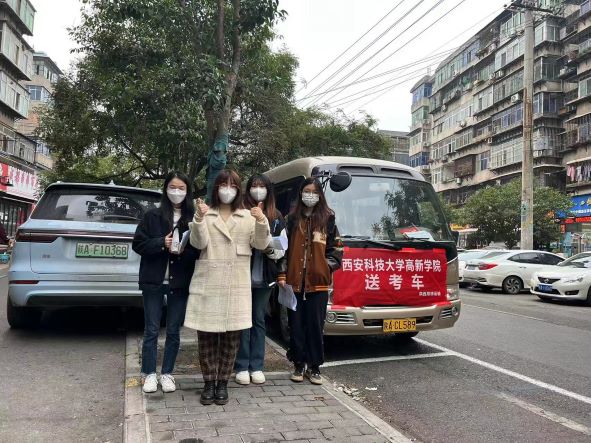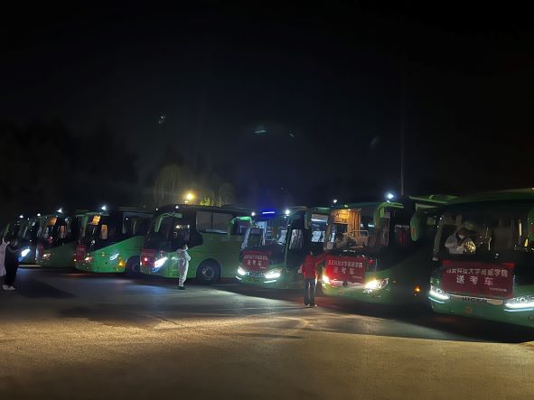 ? ? ? ?10月29日凌晨4點,考生在教學樓前集合,在帶隊老師的帶領下考生們乘坐各自線路的送考車輛奔赴各個考場,帶隊教師全程陪同。