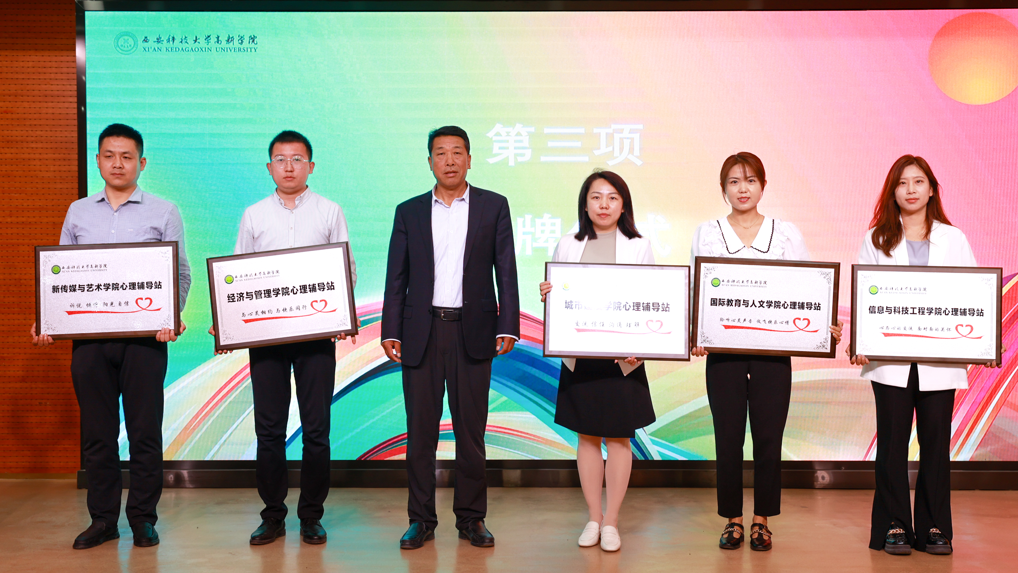 隨后,鄭林科為西安科技大學(xué)高新學(xué)院授牌,汪仁為二級(jí)學(xué)院心理輔導(dǎo)站授牌。二級(jí)學(xué)院心理輔導(dǎo)站授牌儀式標(biāo)志著進(jìn)一步完善了我院心理危機(jī)預(yù)防與干預(yù)體系,希望二級(jí)學(xué)院心理輔導(dǎo)站統(tǒng)一思想認(rèn)識(shí),把心理健康作為平安建設(shè)的重要內(nèi)容,以學(xué)校心理中心為依托,健全宣傳教育、心理預(yù)警、心理疏導(dǎo)、危機(jī)干預(yù)、突發(fā)事件處置等工作機(jī)制和加強(qiáng)隊(duì)伍建設(shè),充分發(fā)揮班級(jí)心理委員、宿舍長(zhǎng)等朋輩互助隊(duì)伍的作用,進(jìn)一步提升學(xué)工人員的心理專(zhuān)業(yè)技能。