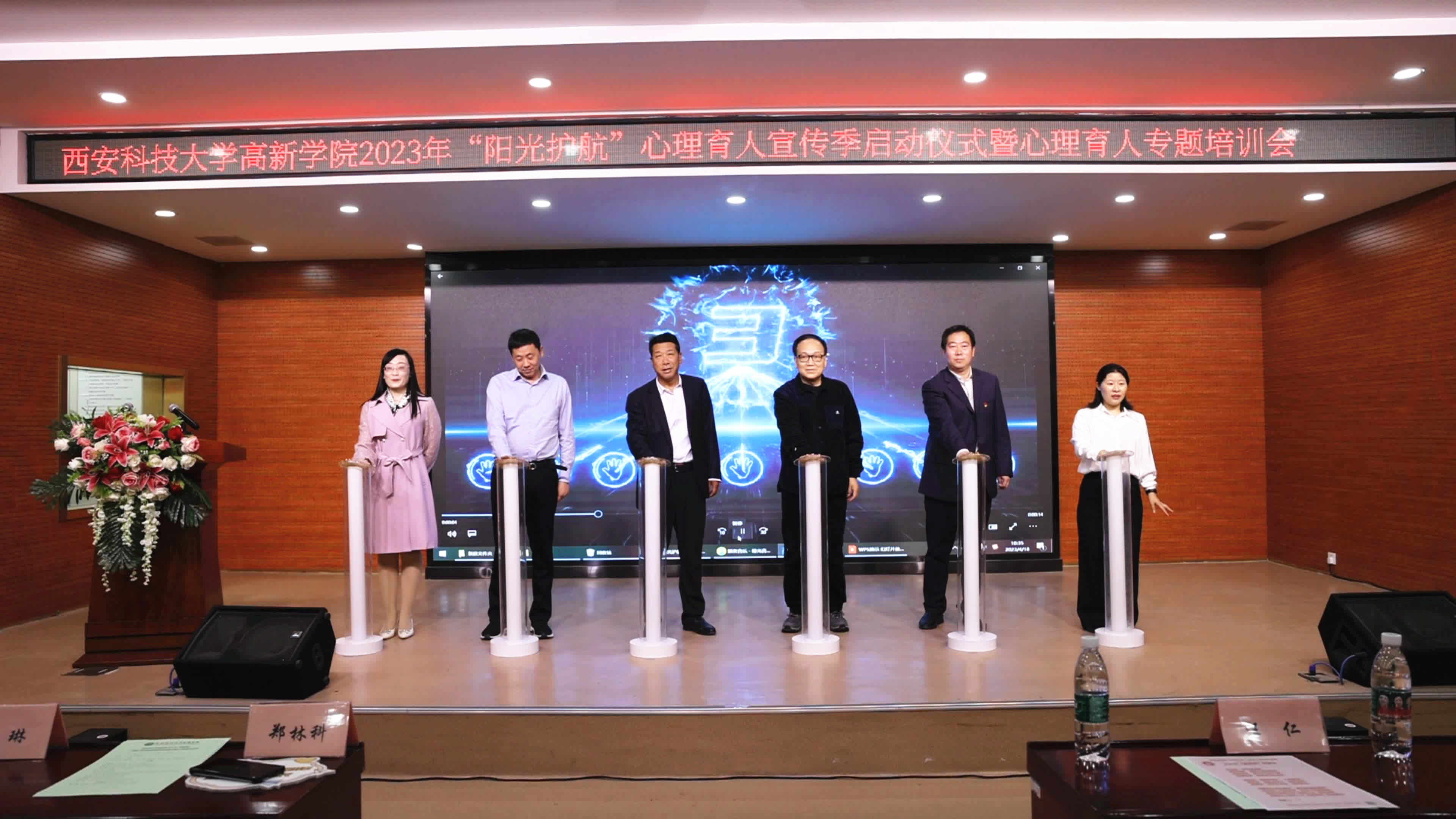 與會(huì)領(lǐng)導(dǎo)共同啟動(dòng)“陽(yáng)光護(hù)航”心理育人宣傳季的六根啟動(dòng)柱,象征著學(xué)生處心理中心和5個(gè)二級(jí)學(xué)院心理輔導(dǎo)站,勠力同心,共同幫助同學(xué)們強(qiáng)化心理健康意識(shí),提高心理素質(zhì),激發(fā)心理潛能,增強(qiáng)心理調(diào)適能力和社會(huì)適應(yīng)能力,全方位地促進(jìn)我校學(xué)生心理健康教育工作。