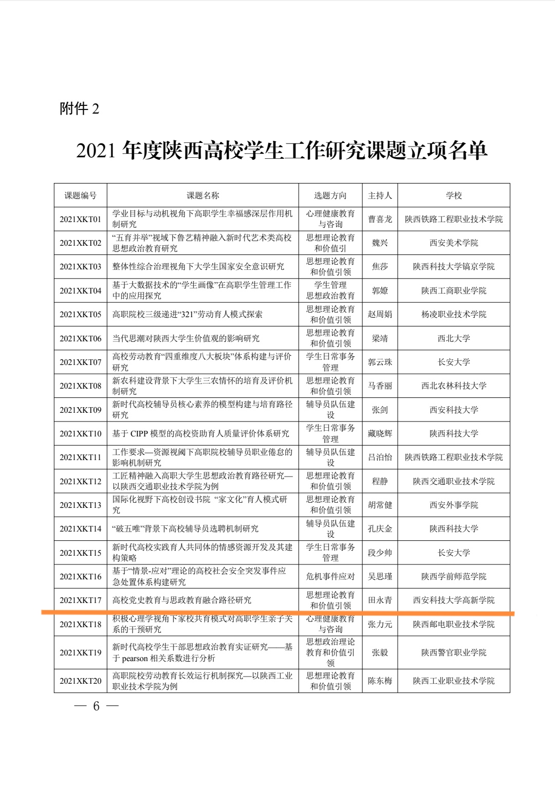 ? ? ? ?近期,中共陜西省委教育工作委員會發(fā)布了《關于公布 2021 年度陜西高校學生工作精品項目和研究課題立項名單的通知》學院國際教育與人文院學院副院長田永青主持的《高校黨史教育與思政教育融合路徑研究》(項目編號:2021XKT17)課題獲批 2021 年度陜西高校學生工作研究課題立項。