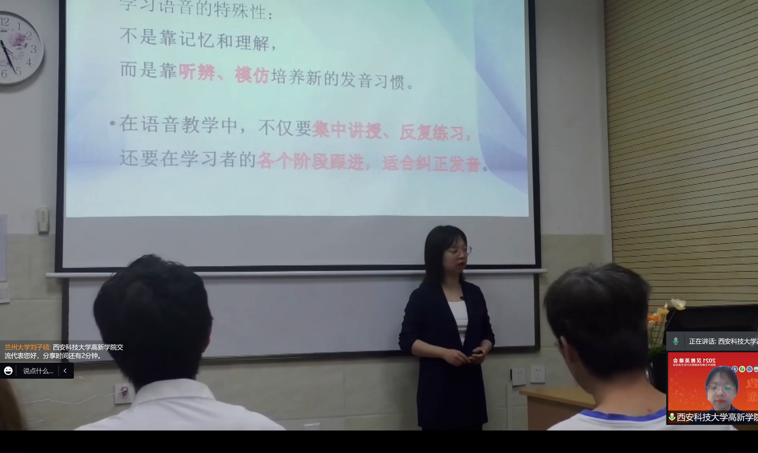 ? ? ? ? 在現(xiàn)場展示環(huán)節(jié),李葉老師就教學(xué)理念、教學(xué)環(huán)節(jié)、教學(xué)創(chuàng)新、教學(xué)成果等方面進(jìn)行了詳細(xì)展示。點(diǎn)評專家蘭州大學(xué)國際文化交流學(xué)院副院長劉曉燕副教授從留學(xué)生授課視頻和漢語國際教育本科生教學(xué)兩個方面進(jìn)行點(diǎn)評,指出留學(xué)生線上漢語教學(xué)具備生動活潑的課堂氛圍,線上授課的年輕教師在與學(xué)生教學(xué)互動時輕松愉悅、注重創(chuàng)新,能夠迅速掌握對線上資源的使用,同時對漢語國際教育本科專業(yè)培養(yǎng)模式給予充分肯定。
