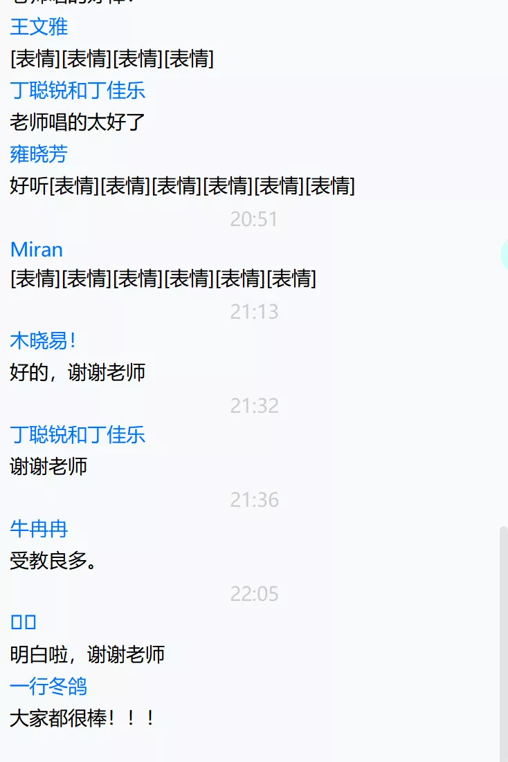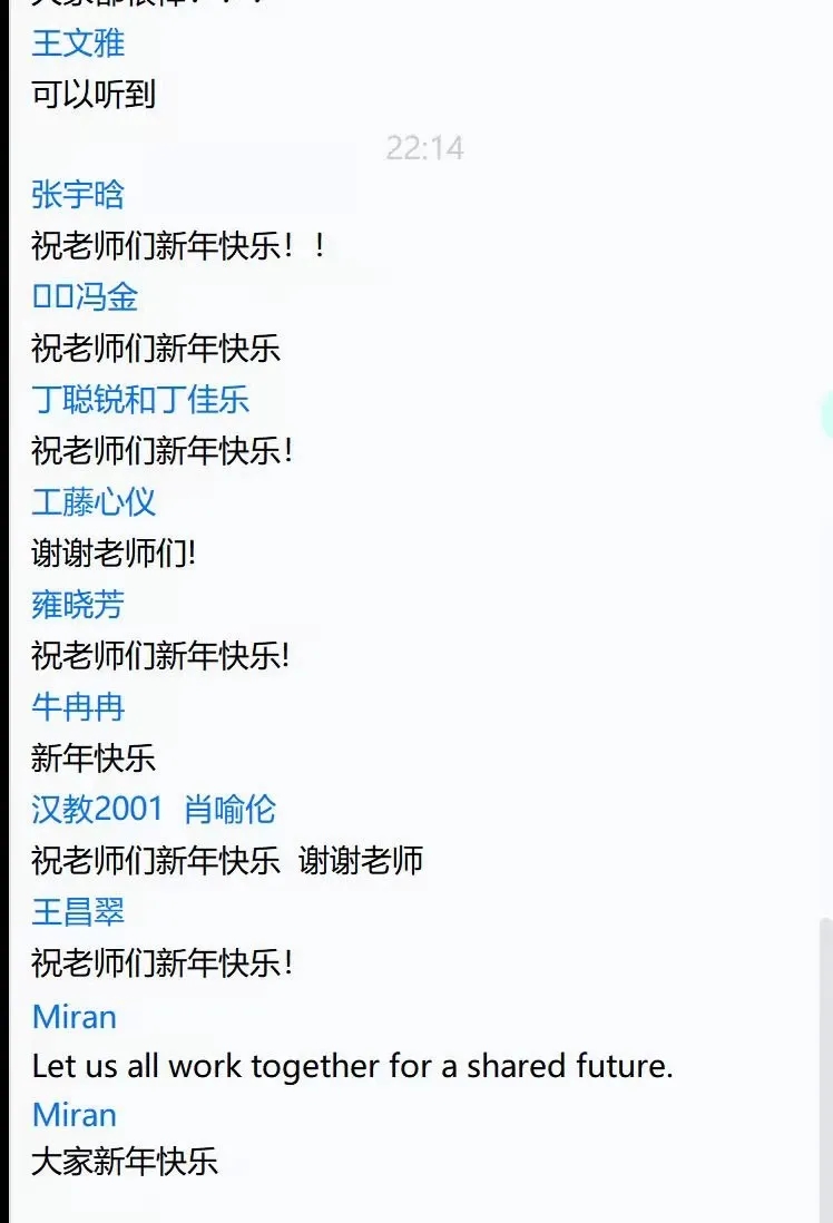 ? ? ? ?在比賽中場休息環(huán)節(jié),漢教專業(yè)四名學(xué)生2019級丁聰銳、曾昕柳、2020級張宇晗、2021級賈雅茜為大家朗誦魯珺歌老師的散文作品《午安!我的城》,并送上祝福語,張宇晗同學(xué)為烘托跨年氣氛用拇指琴彈奏《新年快樂》。主持人王帥老師也為大家送上跨年彩蛋——演唱俄語歌曲《喀秋莎》。線上觀摩的專業(yè)學(xué)生們也紛紛通過聊天框進(jìn)行互動,為參賽選手加油助力、互道新年祝福。