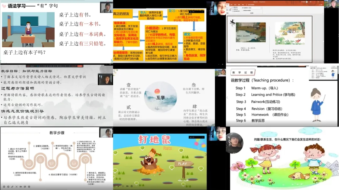 ? ? ? ?在漢語國際教育教研室精心組織、統(tǒng)籌策劃下,專業(yè)各年級學(xué)生踴躍報名、積極參與。經(jīng)過初賽評審組評定,有11名參賽選手脫穎而出,入圍總決賽??倹Q賽采用線上說課展示和講課視頻錄制相結(jié)合的方式,將參賽人員分為5個小組,由專家評委對參賽學(xué)生的線上教學(xué)展示點評指導(dǎo)并進(jìn)行現(xiàn)場評分。