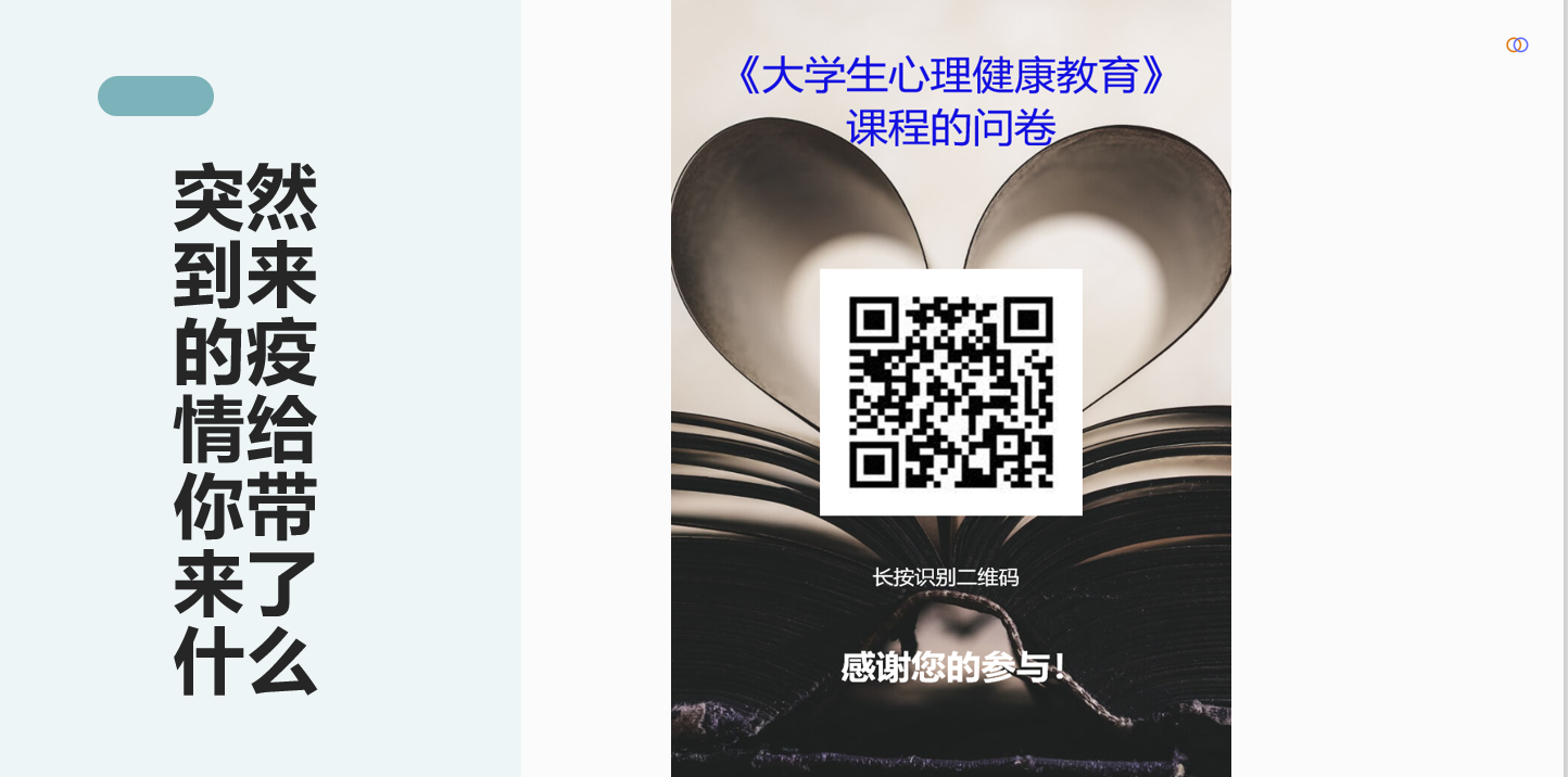 ? ? ? ? 此次講座由心理咨詢教研室副主任吳靜老師,心理健康教育課程陳明羽、宋穎佳老師在所帶班級(jí)線上教學(xué)中,通過(guò)疫情期間《大學(xué)生心理健康教育》課程問(wèn)卷,了解學(xué)生的心理狀況。對(duì)疫情下常見(jiàn)的如焦慮、疑病、恐懼、不確定性、媒介性替代創(chuàng)傷、共情傷害消極心理及應(yīng)激反應(yīng)進(jìn)行知識(shí)性普及。向?qū)W生介紹大學(xué)生疫情期間的自我調(diào)適方法和學(xué)校心理援助、心理危機(jī)干預(yù)及學(xué)校心理咨詢資源。課后讓學(xué)生通過(guò)肌肉放松訓(xùn)練和向社會(huì)尋求力量來(lái)緩解學(xué)來(lái)進(jìn)行疫情期間的自我調(diào)適。
