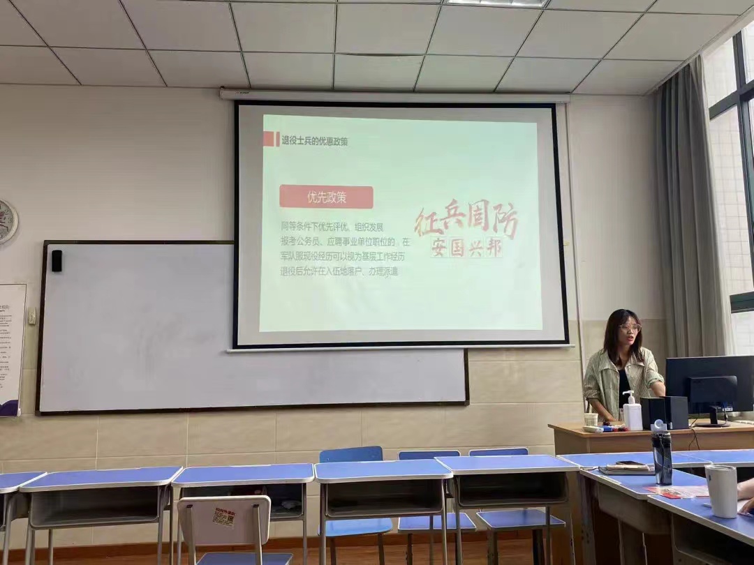 ? ? ? ?培訓(xùn)第二講由征兵宣傳培訓(xùn)專員何花老師宣講征兵政策與入伍條件,講解征兵入伍流程,年齡、體檢、政審等條件上的入伍條件限制,各地出臺代編入伍政策,省廳各類文件優(yōu)待政策、退伍政策等,希望有意報名的同學(xué)積極參加。