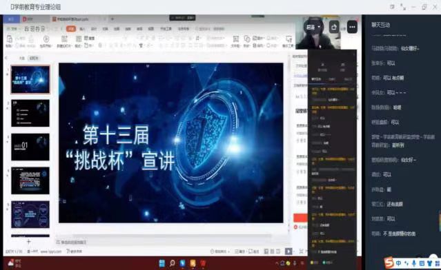 ? ? ? ?10月26日,學前教研室理論組全體教師參與了釘釘線上會議,由王穎老師為大家進行了好書好劇的推薦,馬驍驍老師就2022年版新課程教學大綱的編寫工作進行了部署和安排,杜珊老師就第十三屆“挑戰(zhàn)杯”為老師們進行了解讀。
