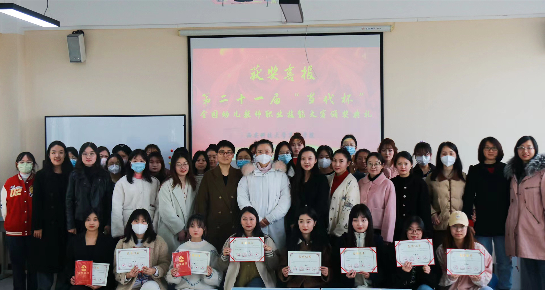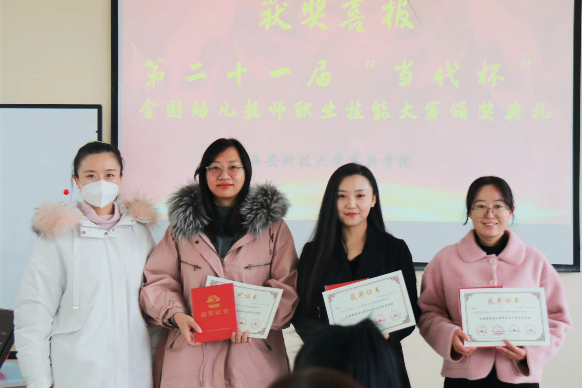 ? ? ? ?3月1日下午,在藝體樓302教室舉行了“當代杯”全國職業(yè)技能大賽頒獎儀式。在國際教育與人文學院副院長張蕓蕓院長及學前教育系骨干教師的帶領下,就本次大賽取得的優(yōu)異成績對參賽師生進行表彰、頒獎。