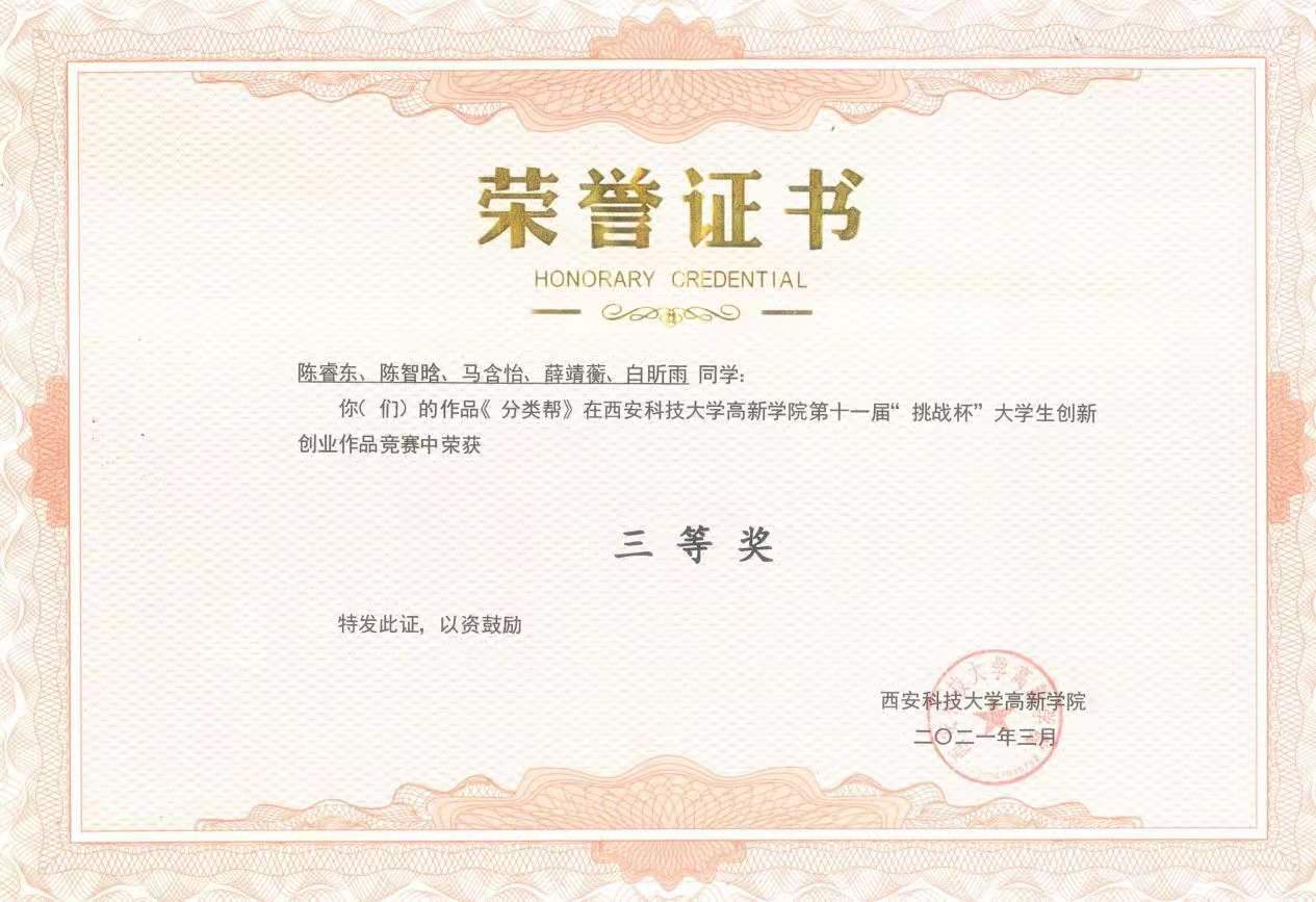 ? ? ? ?近日,學(xué)院組織了西安科技大學(xué)第十一屆“挑戰(zhàn)杯”大學(xué)生創(chuàng)新創(chuàng)業(yè)作品競(jìng)賽。在競(jìng)賽中,國(guó)際教育與人文學(xué)院的中外合作辦學(xué)軟件技術(shù)2020級(jí)陳瑞東、薛靖衡、馬含怡提交了《分類幫》作品。經(jīng)過(guò)西安科技大學(xué)評(píng)委們的嚴(yán)格評(píng)選,最終獲得三等獎(jiǎng)。