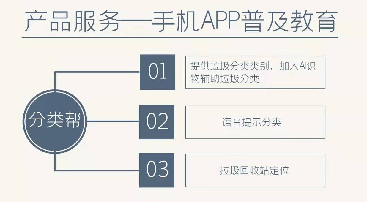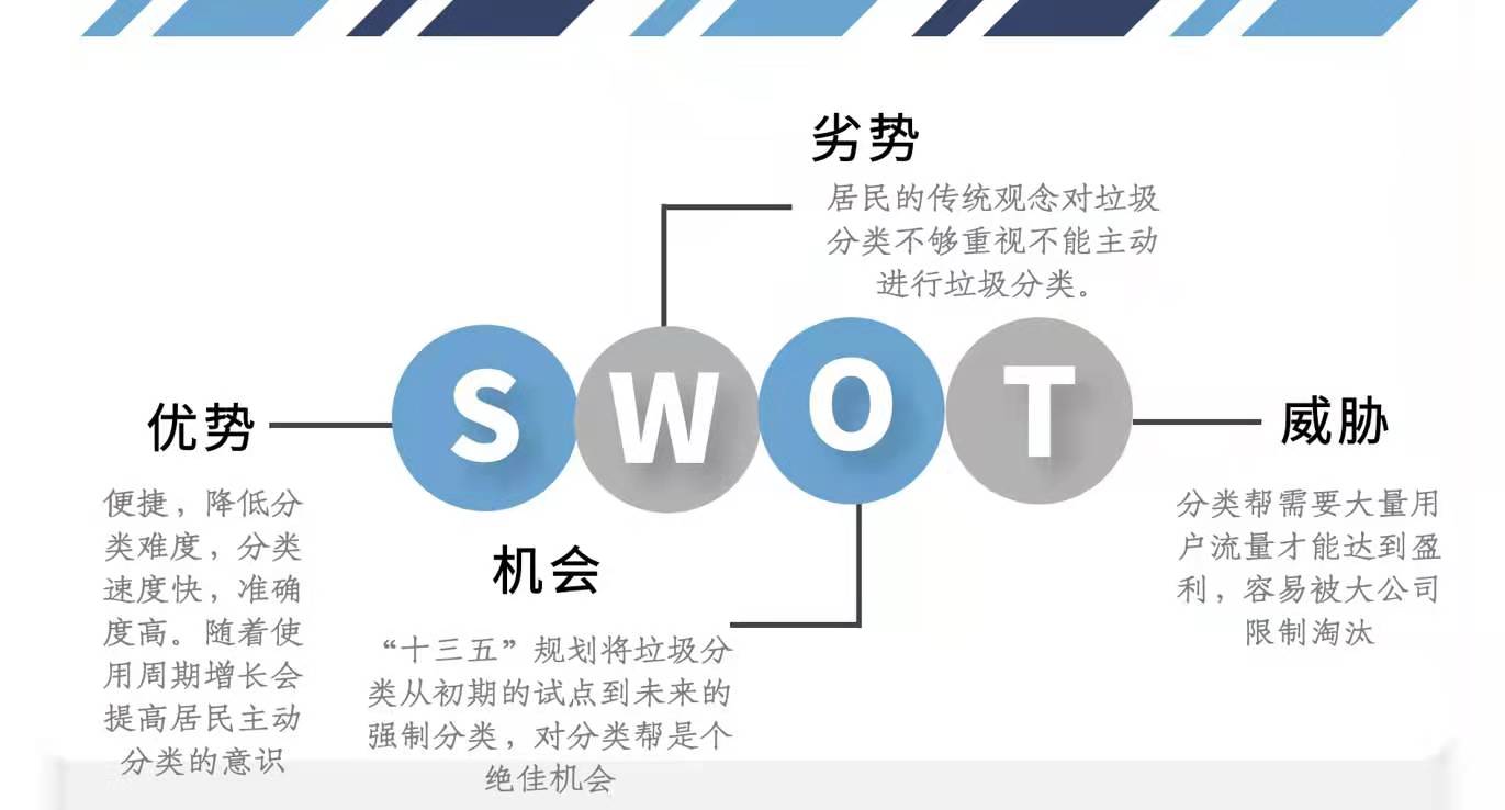 ? ? ? ?《分類幫》作品專注于低碳環(huán)保的垃圾分類,從項(xiàng)目概要、產(chǎn)品服務(wù)、優(yōu)勢(shì)分析、市場(chǎng)營(yíng)銷、團(tuán)隊(duì)成員和創(chuàng)業(yè)計(jì)劃幾個(gè)方面進(jìn)行論述。