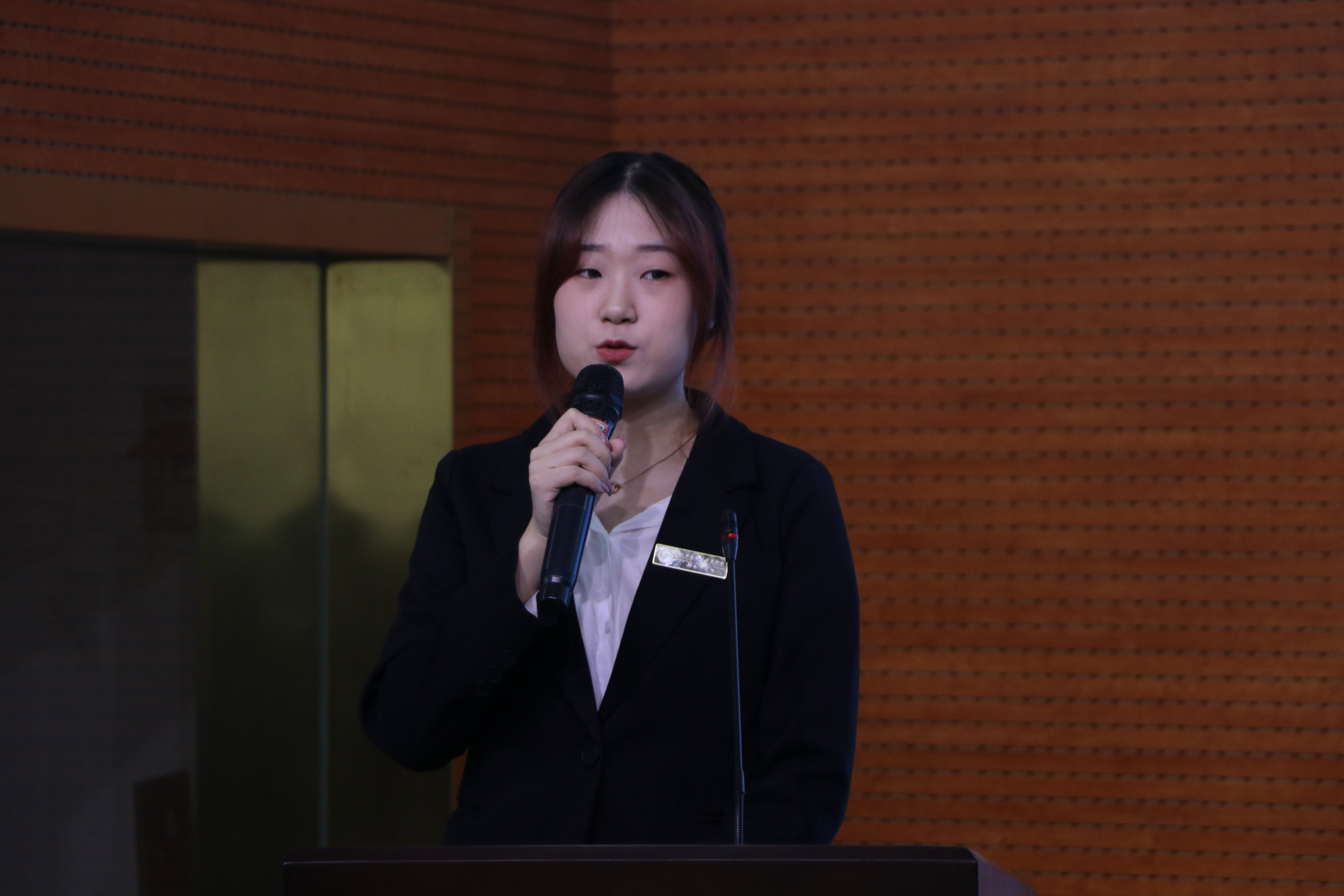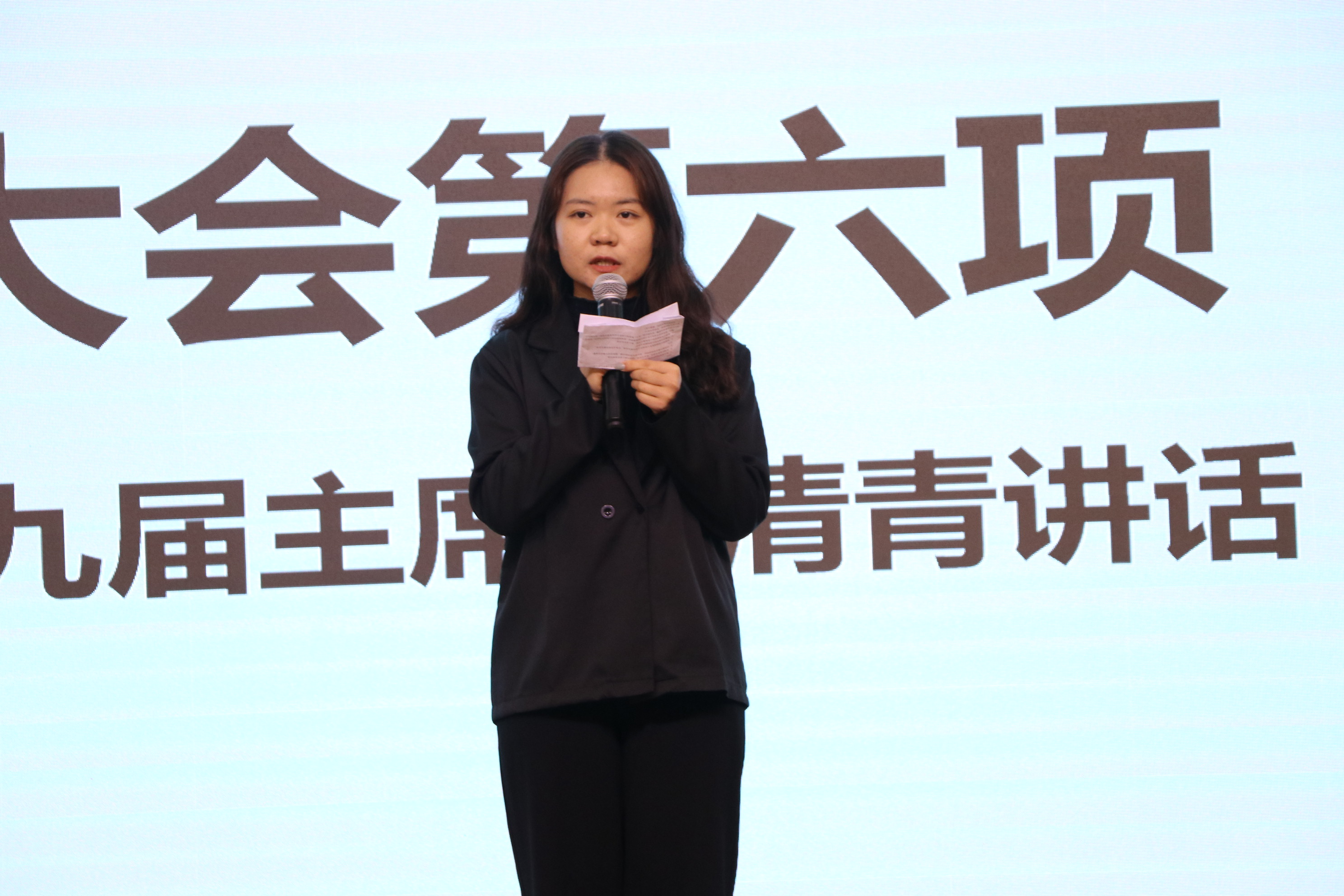 ? ? ? ?大學(xué)生心理健康協(xié)會(huì)第八屆主席邵婷為新一屆主席柳清青發(fā)聘書、進(jìn)行交接旗儀式,她發(fā)言期望新一屆的心協(xié)成員能把這份溫暖和關(guān)注不斷傳遞下去。