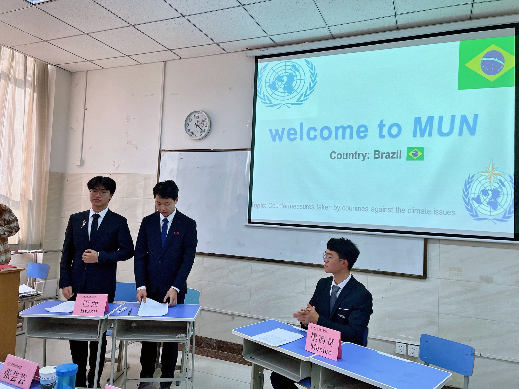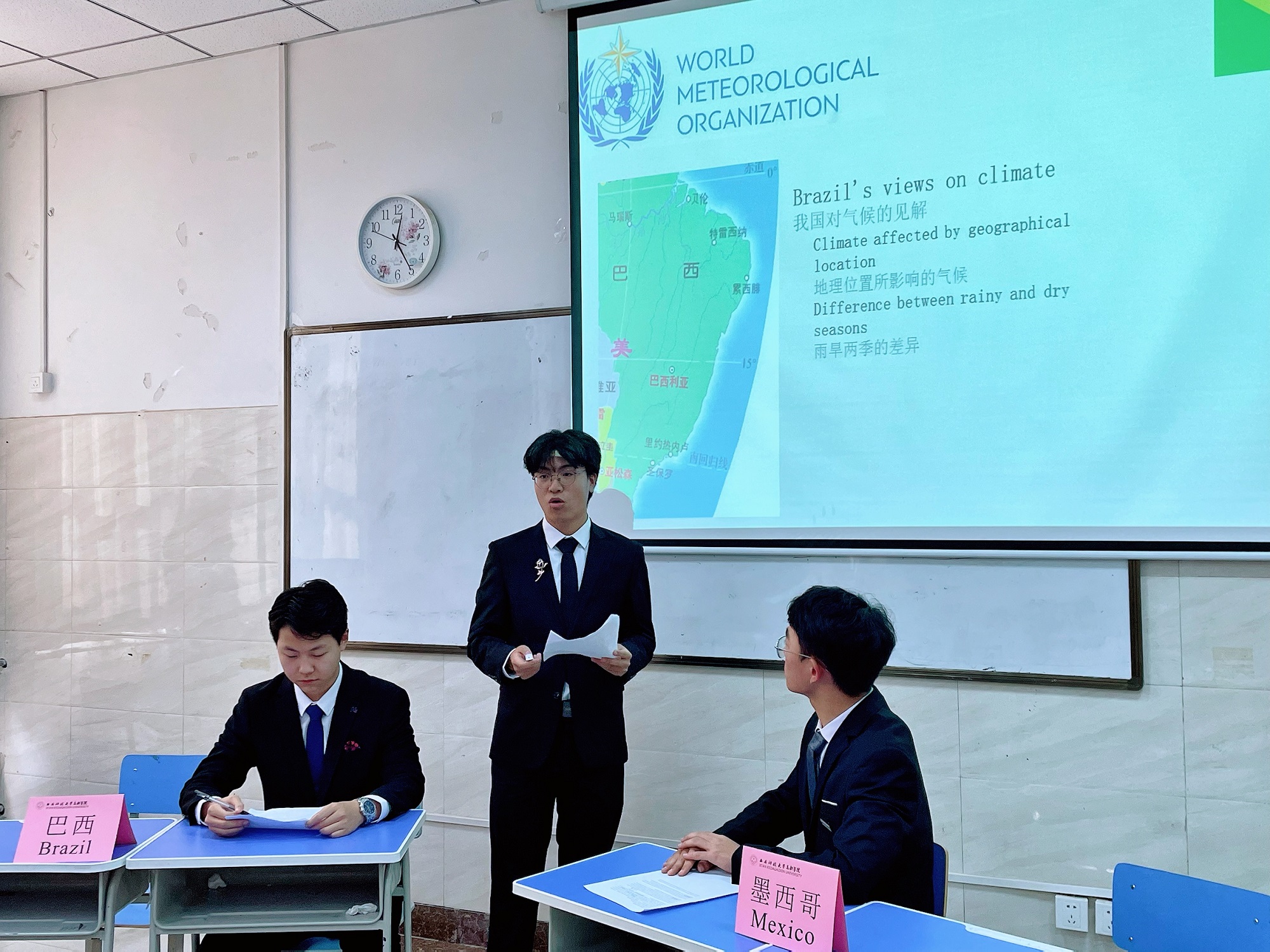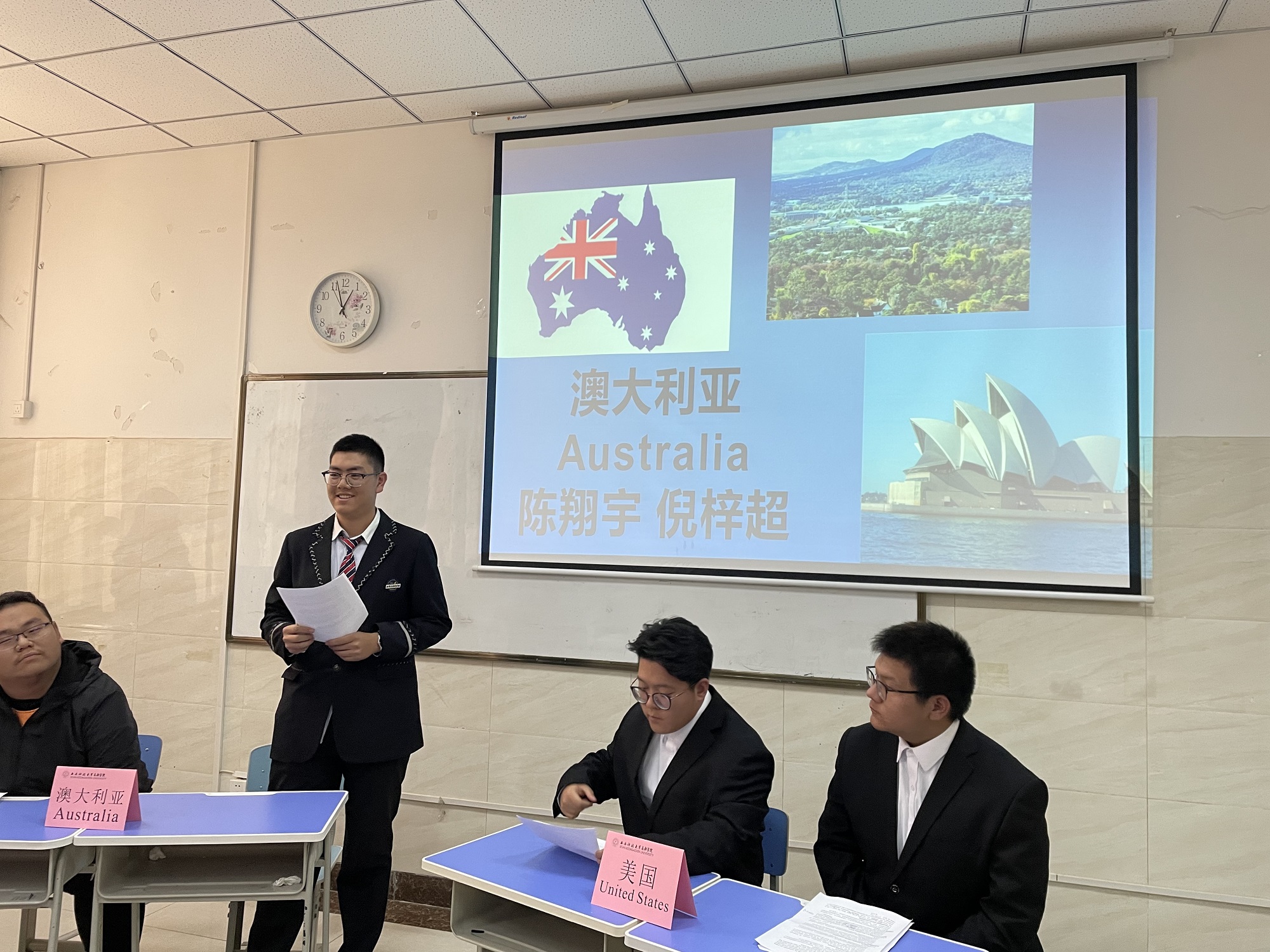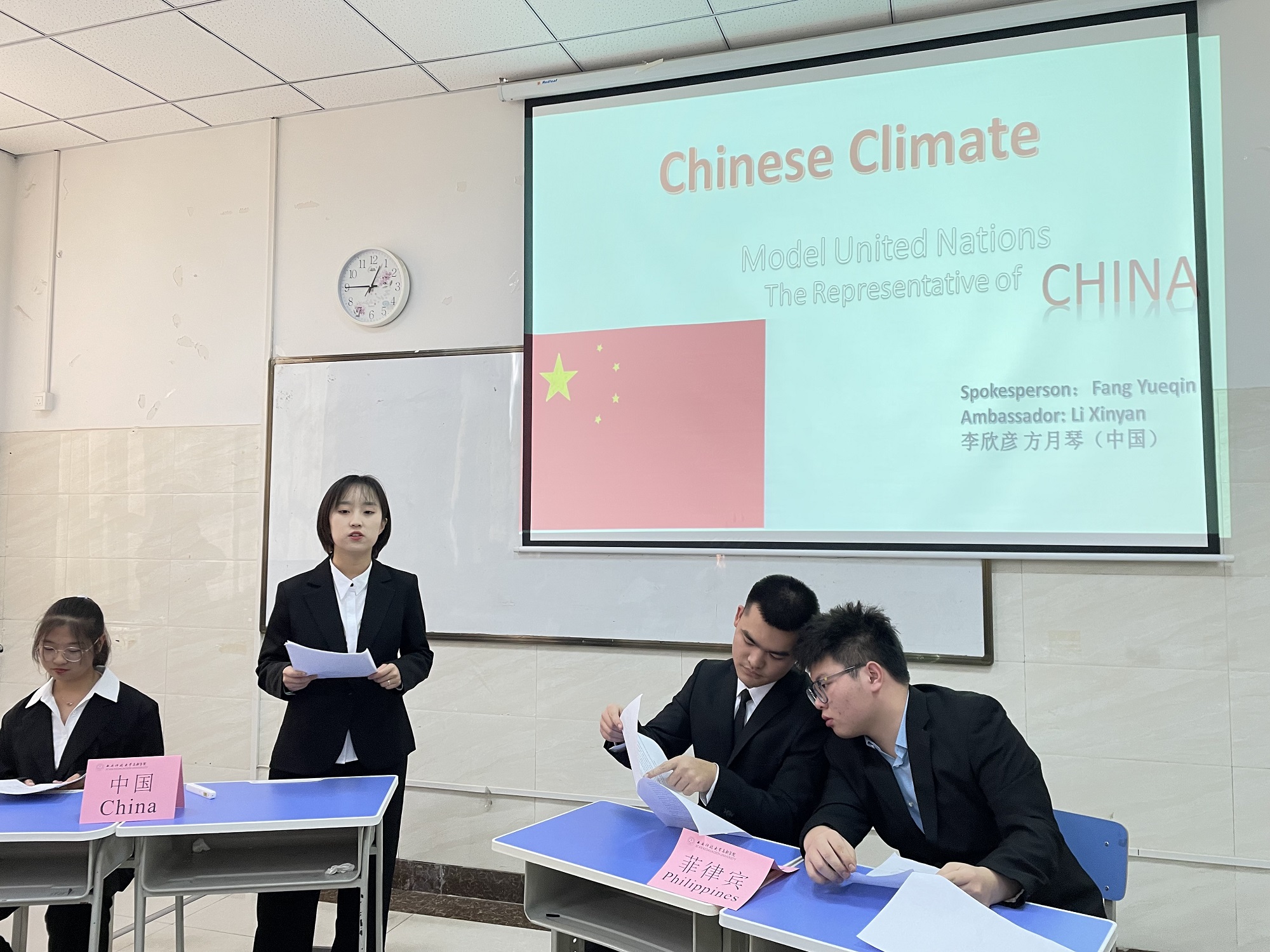 ? ? ? ?在本次大會上,各國代表們圍繞“氣候變化”這一主題進行激勵的討論,并由每個“國家”的大使和發(fā)言人進行英文致辭,闡述本國對“氣候變化”這一議題的看法和立場。同學(xué)們自信大方、慷慨陳詞,展現(xiàn)了國際學(xué)子的風(fēng)采。