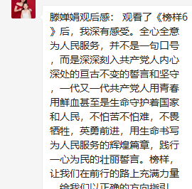 ? ? ? ?截至15日,學(xué)院13個(gè)支部以多種形式觀看《榜樣6》,支部分別積極在微信群發(fā)表觀看心得達(dá)到140多條。在本次觀看學(xué)習(xí)中,學(xué)院黨委參與黨員人數(shù)到500余人,學(xué)院黨委在微信群內(nèi)及時(shí)上傳專(zhuān)題片主題教育網(wǎng)站,要求全體黨支部采取多種方式觀看、交流、撰寫(xiě)觀后感和學(xué)習(xí)體會(huì)等形式學(xué)習(xí)。