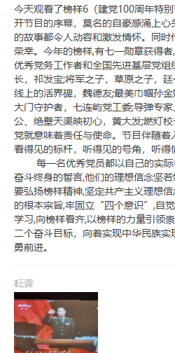 ? ? ? ?《榜樣6》聚焦“不忘初心、牢記使命”主題,本期節(jié)目重點(diǎn)宣傳“七一勛章”獲得者和全國(guó)“兩優(yōu)一先”表彰對(duì)象典型事跡,通過(guò)典型事跡再現(xiàn)、現(xiàn)場(chǎng)訪談、重溫入黨誓詞等形式,生動(dòng)展現(xiàn)中國(guó)共產(chǎn)黨人堅(jiān)定信念、踐行宗旨、拼搏奉獻(xiàn)、廉潔奉公的高尚品質(zhì)和崇高精神,彰顯基層黨組織戰(zhàn)斗堡壘作用和黨員先鋒模范作用,是開(kāi)展黨員教育培訓(xùn)的生動(dòng)教材。