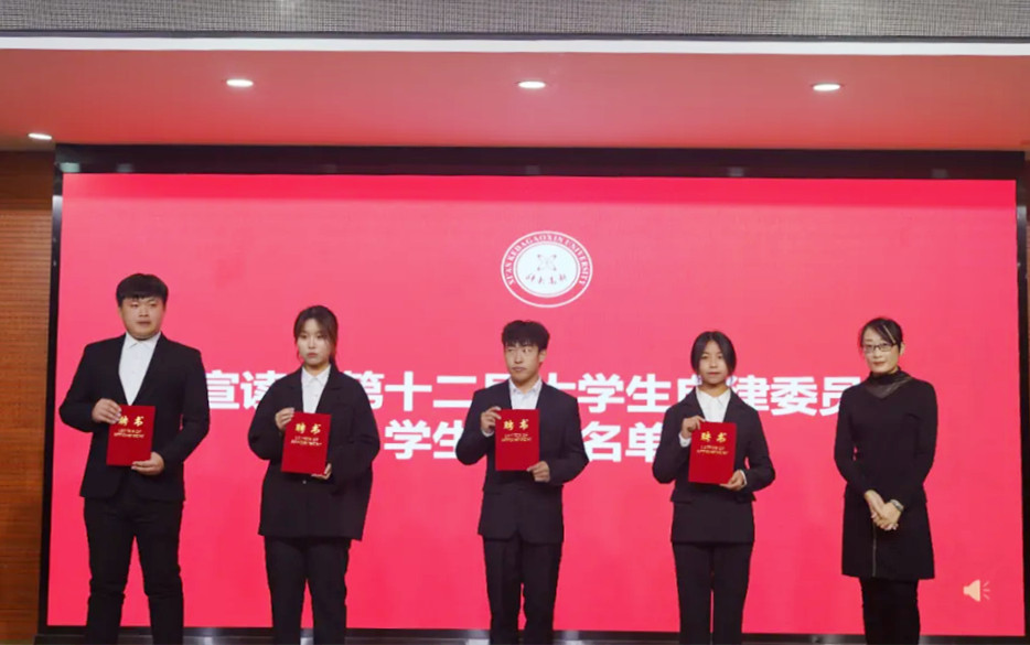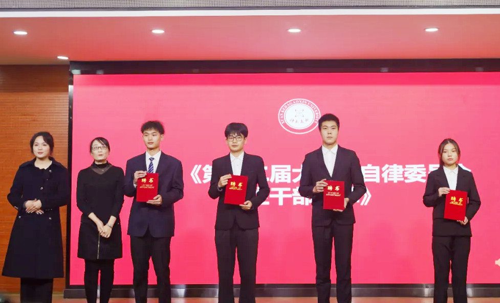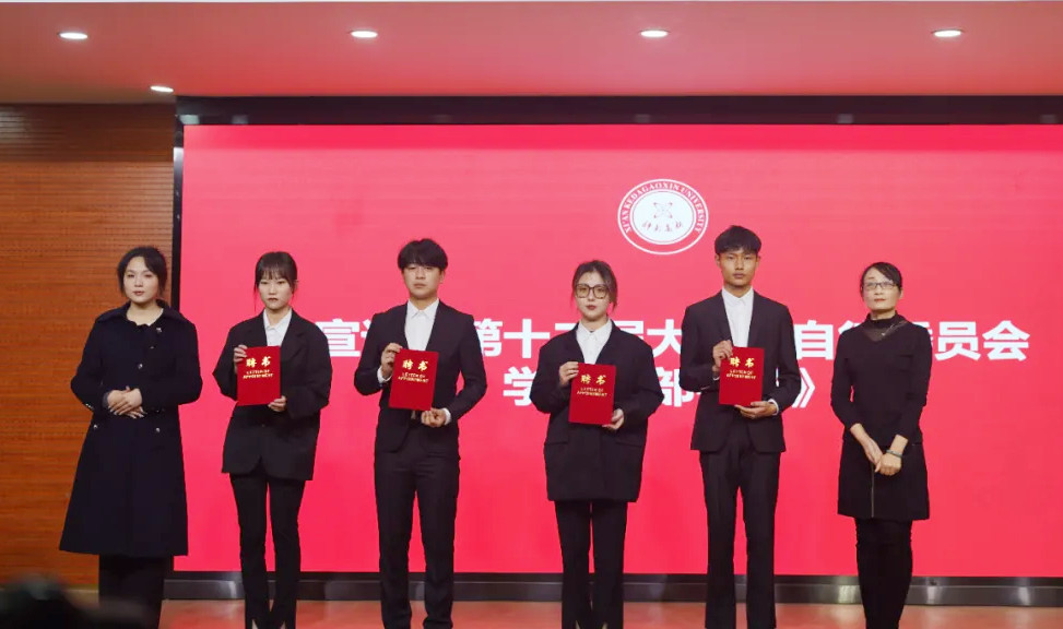 ? ? ? ?學(xué)生處副處長李樂文宣讀《關(guān)于表彰第十一屆大學(xué)生自律委員會優(yōu)秀學(xué)生干部和優(yōu)秀干事的決定》。學(xué)生處處長胡純宣讀《第十二屆大學(xué)生自律委員會學(xué)生干部名單》并頒發(fā)聘書。新傳媒與藝術(shù)學(xué)院院長助理席洲為優(yōu)秀學(xué)生干部頒布證書。經(jīng)濟(jì)與管理學(xué)院院長助理劉雨豪為優(yōu)秀干事頒布證書。