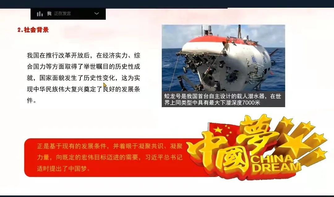 ? ? ? ?課上,戴軍首先講到“中國夢”,從它的提出及歷史背景到現(xiàn)在的發(fā)展現(xiàn)象進行了詳細講解。發(fā)展對象是祖國的未來,是當(dāng)代青年的領(lǐng)軍人,需努力提高思想覺悟,堅定理想信念,樹立遠大理想,鍛煉實踐能力。