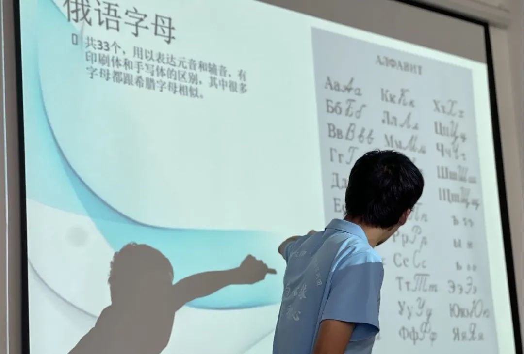 ? ? ? ?課上,王明鑄首先通過(guò)介紹俄羅斯標(biāo)志性建筑、文化傳統(tǒng)、知名人物使學(xué)生們對(duì)俄羅斯有了初步的了解。接著,用俄語(yǔ)字母表引出今天的主題,講授了簡(jiǎn)單名詞和打招呼的方式,將其中文含義、運(yùn)用場(chǎng)景詳細(xì)地教給了學(xué)生們。隨后不斷以對(duì)話(huà)和提問(wèn)的方式來(lái)鞏固學(xué)生們剛剛所學(xué)的知識(shí)。最后再通過(guò)獨(dú)特有趣的游戲方式,讓每個(gè)學(xué)生都有開(kāi)口說(shuō)俄語(yǔ),鍛煉自己口語(yǔ)的機(jī)會(huì)。授課過(guò)程中學(xué)生們積極配合,此起彼伏的俄語(yǔ)跟讀聲響徹教室。