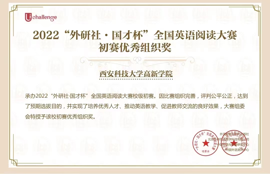 ? ? ? ?本次大賽得到國際教育與人文學(xué)院教學(xué)院長劉淑穎教授的全力支持和指導(dǎo),以及全體英語專業(yè)教研室教師們的團結(jié)合作、共同努力。國際教育與人文學(xué)院英語專業(yè)教研室在2022“外研社·國才杯”大賽中,因為組織大賽完善有序、評判公平公正,為學(xué)院獲得了國才杯全國英語閱讀大賽、寫作大賽的優(yōu)秀組織獎。