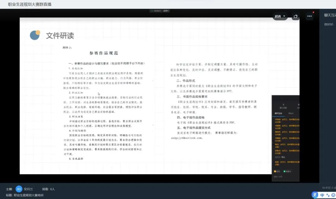 ? ? ? ? 隨后,安月蘭老師以親身經(jīng)歷向同學們強調(diào)了職業(yè)生涯規(guī)劃對大學生生涯的重要性,要求同學們在規(guī)劃書中須精簡寫明自己對未來職業(yè)的認知和規(guī)劃,從而根據(jù)自己的專業(yè)特長知識結構,結合社會環(huán)境與市場環(huán)境,對將來要從事的職業(yè)以及要達到的職業(yè)目標所做出方向性的方案,并對賽事現(xiàn)場答辯做出詳細指導。