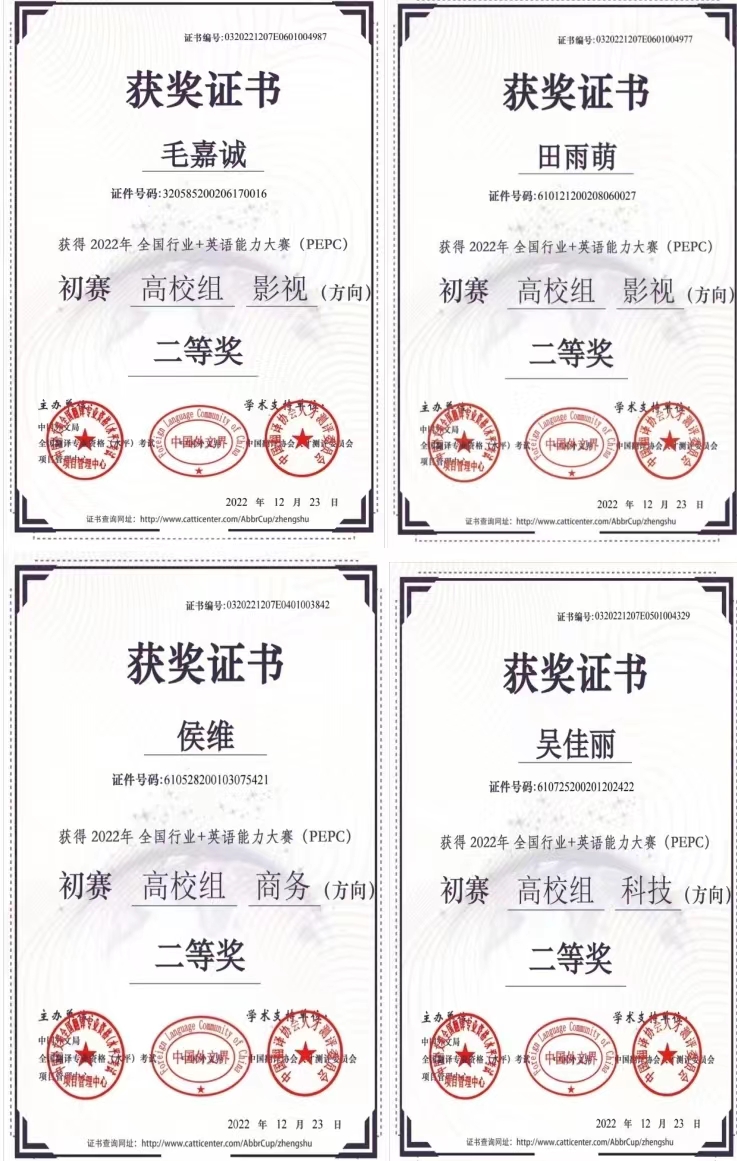 ? ? ? ? 12月,國際教育與人文學(xué)院英語專業(yè)毛嘉誠、田雨萌等10名同學(xué)、商務(wù)英語專業(yè)楊蘇玉、黃欣同學(xué)在2022年全國行業(yè)+英語能力大賽初賽中榮獲二等獎。