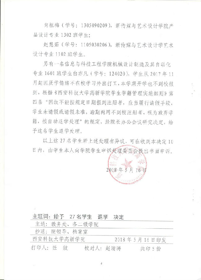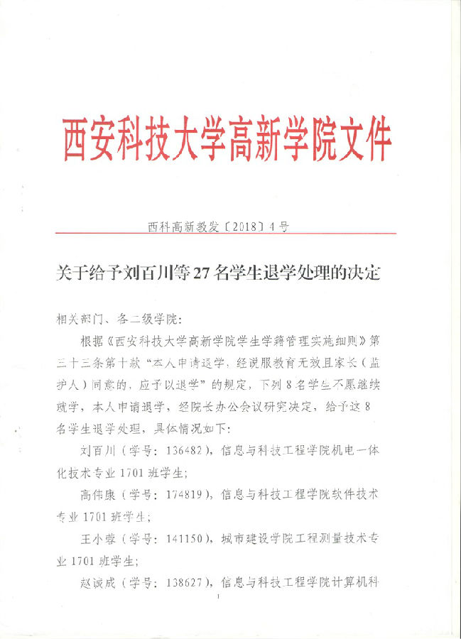 關(guān)于給予劉百川等27名學(xué)生退學(xué)處理的決定