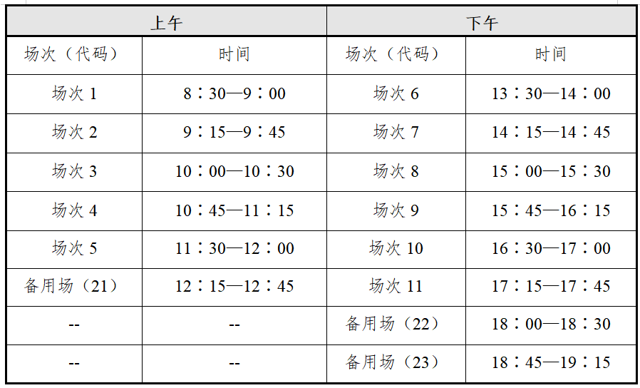 ? ? ? ?英語四級(jí)口語考試(CET-SET4)考試時(shí)間為11月20日(F213次),英語六級(jí)口語考試(CET-SET6)考試時(shí)間為11月21日(S214次),具體場(chǎng)次安排如下: