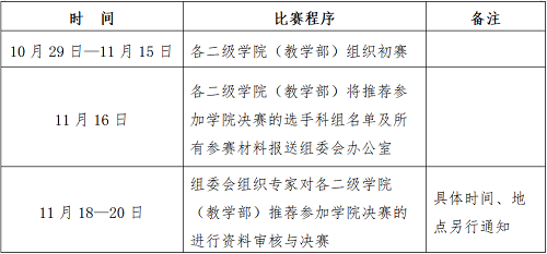 ? ? ? ?各二級(jí)學(xué)院(教學(xué)部)報(bào)送參加學(xué)院決賽選手的名額為:5個(gè)二級(jí)學(xué)院各2名,3個(gè)教學(xué)部各1名。