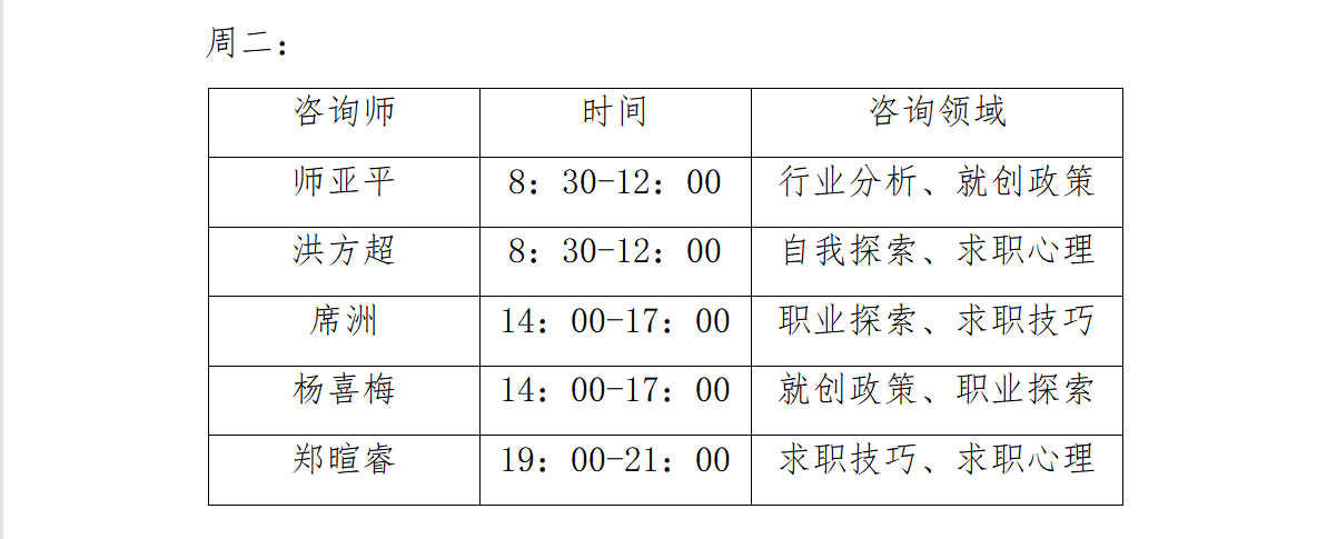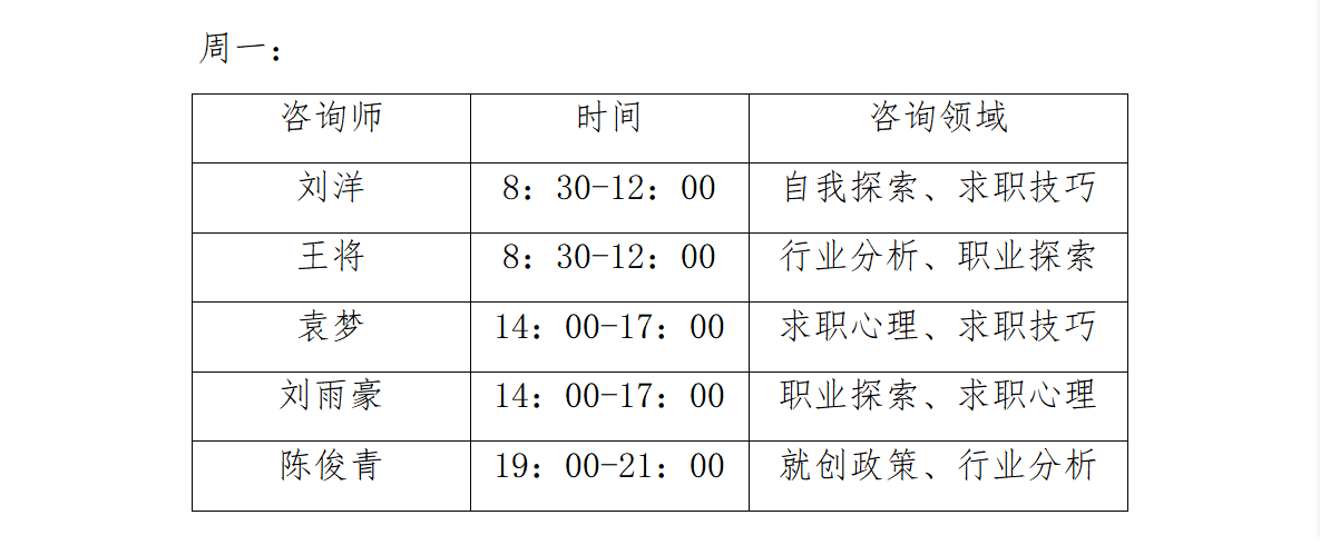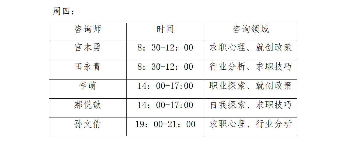 ? ? ? ?為滿足學(xué)院學(xué)生的生涯發(fā)展個(gè)性化需求,提升學(xué)生求職能力和就業(yè)競爭力,就業(yè)與創(chuàng)業(yè)辦公室打造職業(yè)咨詢室致力提供全天化的專業(yè)職業(yè)咨詢與指導(dǎo),解決同學(xué)們在擇業(yè)、就業(yè)、求職及職業(yè)規(guī)劃等方面的困惑。職業(yè)咨詢室咨詢師資均具有豐富就業(yè)工作經(jīng)驗(yàn)并取得高校就業(yè)指導(dǎo)教師認(rèn)證,具體咨詢時(shí)間安排如下: